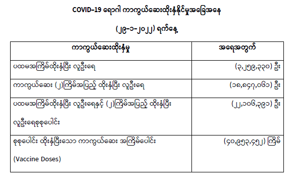 COVID-19 ရောဂါ ကာကွယ်ထိန်းချုပ်ရေးအတွက် တိုင်းဒေသကြီး/ပြည်နယ်များတွင် COVID-19 ရောဂါကာကွယ်ဆေးကို ဦးတည်အုပ်စုများသတ်မှတ်၍ ထိုးနှံပေးလျက်ရှိရာ (၂၉-၁-၂၀၂၂) ရက်နေ့အထိ လူဦးရေစုစုပေါင်း (၂၂,၁၀၆,၃၉၁) ဦးအား ထိုးနှံပေးပြီးဖြစ်၍ ကာကွယ်ဆေး နှစ်ကြိမ် အပြည့်ထိုးနှံပြီးစီးသူ (၁၈,၈၄၇,၀၆၁) ဦး နှင့် ပထမအကြိမ်ထိုးနှံပြီးစီးသူ (၃,၂၅၉,၃၃၀) ဦး ရှိပြီဖြစ်ပါသည်။ သို့ဖြစ်ပါ၍ (၂၉-၁-၂၀၂၂) ရက်နေ့အထိ မြန်မာနိုင်ငံတွင် COVID-19 ရောဂါကာကွယ်ဆေး အကြိမ်ရေ စုစုပေါင်း (၄၀,၉၅၃,၄၅၂) ကြိမ် ထိုးနှံပြီးဖြစ်ပါသည်။