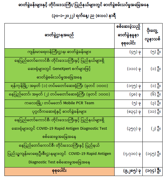 သို့ဖြစ်ပါ၍ ယနေ့အထိ ဓာတ်ခွဲနမူနာစုစုပေါင်း (၆,၃၄၅,၃၄၈) ခုအား စစ်ဆေးခဲ့ပြီး COVID-19 ဓာတ်ခွဲအတည်ပြုလူနာ စုစုပေါင်း (၅၃၅,၂၅၄) ဦး ရှိပြီ ဖြစ်ပါသည်။
