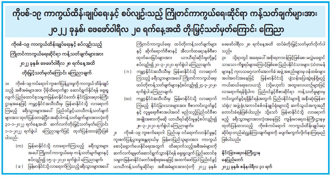 ကိုဗစ် − ၁၉ ကာကွယ်ထိန်းချုပ်ရေးနှင့် စပ်လျဉ်းသည့် ကြိုတင်ကာကွယ်ရေးဆိုင်ရာ ကန့်သတ်ချက်များအား ၂၀၂၂ ခုနှစ်၊ ဖေဖော်ဝါရီလ ၂၈ ရက်နေ့အထိ တိုးမြှင့်သတ်မှတ်ကြောင်း ကြေညာ 02/01/2022