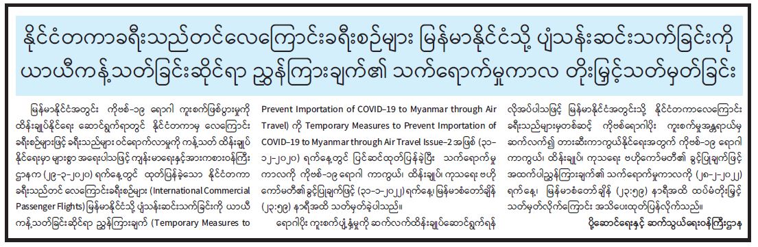 နိုင်ငံတကာခရီးသည်တင်လေကြောင်းခရီးစဉ်များ မြန်မာနိုင်ငံသို့ ပျံသန်းဆင်းသက်ခြင်းကို ယာယီကန့်သတ်ခြင်းဆိုင်ရာ ညွှန်ကြားချက်၏ သက်ရောက်မှုကာလ တိုးမြှင့်သတ်မှတ်ခြင်း 02/01/2022