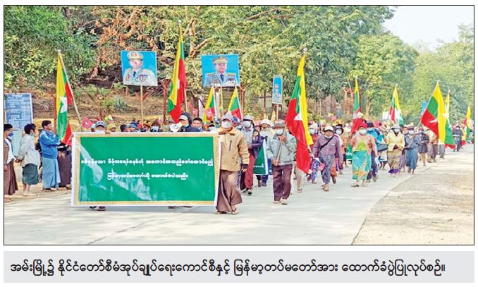 ၂၀၀၈ ခုနှစ် ဖွဲ့စည်းပုံအခြေခံဉပဒေနှင့်အညီ ဆောင်ရွက်လျက်ရှိသည့် နိုင်ငံတော် စီမံအုပ်ချုပ်ရေးကောင်စီအား ထောက်ခံပွဲကို ယနေ့တွင် ကချင်ပြည်နယ်၊ မြစ်ကြီးနားမြို့၌ လည်းကောင်း၊ ရှမ်းပြည်နယ် (မြောက်ပိုင်း)၊ ကွမ်းလုံမြို့နှင့် လောက်ကိုင်မြို့တို့၌ လည်းကောင်း၊ ရှမ်းပြည်နယ်(တောင်ပိုင်း)၊ လွိုင်လင်မြို့နှင့် နမ့်စန်မြို့၌လည်းကောင်း၊ ရှမ်းပြည်နယ် (အရှေ့ပိုင်း) အတွင်းရှိ မြို့နယ် ၅ မြို့နယ်တို့၌ လည်းကောင်း၊ မွန်ပြည် နယ်အတွင်းရှိ မြို့နယ် ၆ မြို့နယ်နှင့် ကရင်ပြည်နယ်၊ လှိုင်းဘွဲမြို့၌လည်းကောင်း၊ ရန်ကုန်တိုင်းဒေသကြီး၊ မရမ်းကုန်းမြို့နယ်နှင့် ကမာရွတ်မြို့နယ်၌လည်းကောင်း၊ ဧရာဝတီတိုင်းဒေသကြီး၊ ကျိုက်လတ် မြို့၌လည်းကောင်း၊ ရခိုင်ပြည်နယ်အတွင်းရှိ မြို့နယ် ၈ မြို့နယ်နှင့် ချင်းပြည်နယ်၊ ပလက်ဝမြို ့တို့၌ လည်း ကောင်း၊ စစ်ကိုင်းတိုင်းဒေသကြီး၊ မုံရွာမြို့၊ ခန္တီးမြို့နှင့် မော်လိုက်မြို့၌ လည်း ကောင်း၊ မန္တလေးတိုင်းဒေသကြီးအတွင်းရှိ မြို့နယ် ၁၆ မြို့နယ်နှင့် မကွေးတိုင်း ဒေသကြီး အတွင်းရှိ မြို့နယ် ၅ မြို့ နယ်တို့၌လည်းကောင်း အသီးသီးပြုလုပ်ကြပြီး ဆန္ဒဖော်ထုတ်ခဲ့ကြသည်။