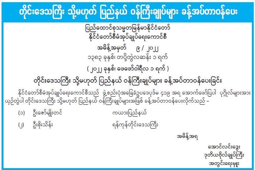 ၂၀၂၆-၂၀၂၇ ဘဏ္ဍာရေးနှစ် အမျိုးသားစီမံကိန်းဥပဒေ၊ ၂၀၂၆-၂၀၂၇ ဘဏ္ဍာရေးနှစ် ပြည်ထောင်စု၏ ဘဏ္ဍာငွေအရအသုံးဆိုင်ရာဥပဒေတို့အား အတည်ပြုထုတ်ပြန်