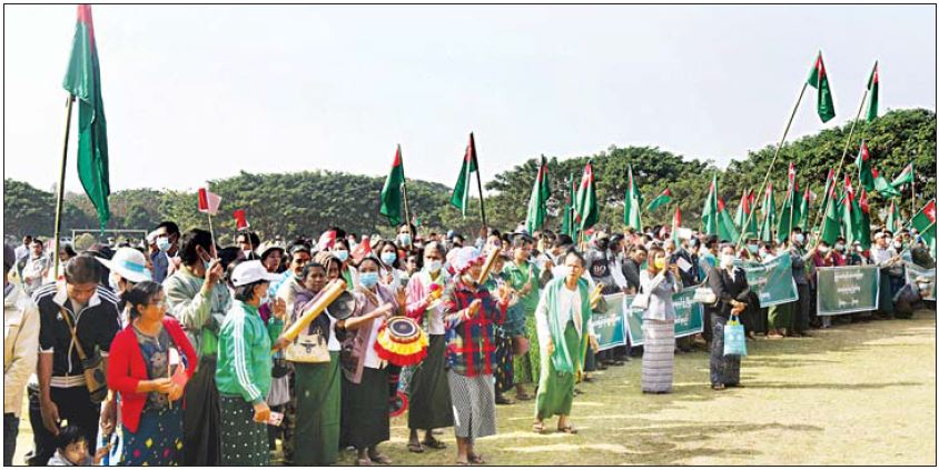 ၂၀၀၈ ခုနှစ် ဖွဲ့စည်းပုံအခြေခံဥပဒေနှင့်အညီ ဆောင်ရွက်လျက်ရှိသည့် နိုင်ငံတော်စီမံအုပ်ချုပ်ရေး ကောင်စီအား ထောက်ခံပွဲကို နေပြည်တော် ဇမ္ဗူသီရိမြို့နယ် ရွှေကြာပင်ရပ်ကွက် လူငယ်အားကစား ကွင်းတွင် ယနေ့နံနက်ပိုင်းက ကျင်းပသည်။