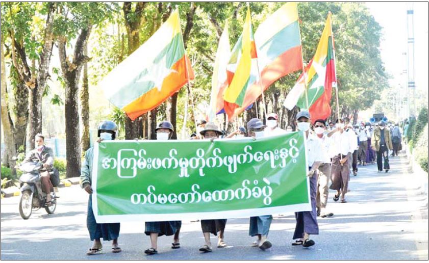 ထိုသို့ ဆန္ဒဖော်ထုတ်ရာတွင် “နိုင်ငံတော်စီမံ အုပ်ချုပ်ရေးကောင်စီအား ထောက်ခံပါသည်၊ အမျိုး ဘာသာ သာသနာကို စောင့်ရှောက်သော မြန်မာ့ တပ်မတော်အား ထောက်ခံပါသည်၊ NUG၊ CRPH၊ PDF အကြမ်းဖက်သမား အလိုမရှိ၊ NUG၊ CRPHI PDF အကြမ်းဖက်လုပ်ရပ်များအား ဆန့်ကျင်ကြ၊ ပြည်ထောင်စုမပြိုကွဲရေး ဒို့အရေး၊ တိုင်းရင်းသား စည်းလုံးညီညွတ်မှုမပြိုကွဲရေး ဒို့အရေး၊ အချုပ်အခြာ အာဏာတည်တံ့ခိုင်မြဲရေး ဒို့အရေး၊ ပြည်ပအားကိုး ပုဆိန်ရိုးများအား ဆန့်ကျင်ကြ၊ မြန်မာ့ပြည်တွင်းရေး ပြည်ပစွက်ဖက်မှုအလိုမရှိ၊ နိုင်ငံတော်စီမံအုပ်ချုပ်ရေး ကောင်စီလုပ်ငန်းစဉ်(၅) ရပ်အား ထောက်ခံပါ သည်၊ ပြည်ဖျက်သည့် CRPH၊ NUG၊ လူသတ်သည့် PDF ဆန့်ကျင်ကြ၊ NUG၊ PDF အကြမ်းဖက်မှု အမြစ်ဖြတ်၊ NUG၊ PDF အကြမ်းဖက်မှုတွေ မြင်အောင်ကြည့်၊ NUG၊ PDF ရဲ့ ပြည်သူ့အပေါ် အကြမ်းဖက်မှုချက်ချင်းရပ်၊ အကြမ်းဖက်လူသတ်သမား PDF အဖွဲ့များ အမြန်ဆုံး ကျဆုံးပါစေ စသည့် စာသားပါဆိုင်းဘုတ်များအား ကိုင်ဆောင်ကြွေးကြော်ခဲ့ကြကြောင်း သိရသည်။