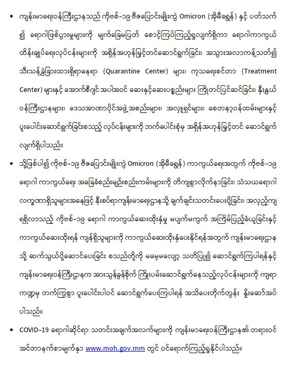 ကျန်းမာရေးဝန်ကြီးဌာနအနေဖြင့် နိုင်ငံအတွင်း ကူးစက်ဖြစ်ပွားနေသော COVID-19 ရောဂါ ကာကွယ်၊ ကုသ၊ ထိန်းချုပ်ရေးလုပ်ငန်းများကို အရှိန်အဟုန်မြှင့်ဆောင်ရွက်လျက်ရှိရာ ရောဂါထိန်းချုပ်ရေးလုပ်ငန်းများ အောင်မြင်နိုင်ရေးအတွက် ပြည်သူလူထုအနေဖြင့် ကျန်းမာရေးဝန်ကြီးဌာနမှ ထုတ်ပြန်ထားသော COVID-19 ရောဂါကာကွယ်ထိန်းချုပ်ရေး ဆိုင်ရာစည်းကမ်းများကို စနစ်တကျ လိုက်နာဆောင်ရွက်ရန်လိုအပ်ပြီး COVID-19 ကာကွယ်ဆေးထိုးနှံမှုခံယူခြင်းအား အထူးဂရုပြု ပူးပေါင်းဆောင်ရွက်ကြရန် လိုအပ်ပါသည်။