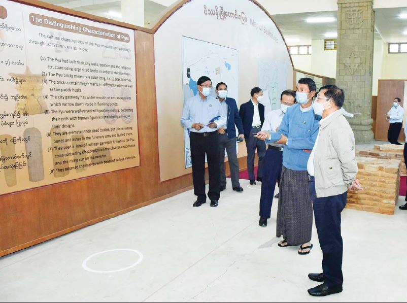 ထို့နောက် နိုင်ငံတော်စီမံအုပ်ချုပ်ရေးကောင်စီဥက္ကဋ္ဌ၊ နိုင်ငံတော်ဝန်ကြီးချုပ်၊ ဇနီးနှင့် အဖွဲ့ဝင်များသည် ပြတိုက်အတွင်းပြသထားရှိသည့် ဗိဿနိုးမြို့ဟောင်းမြေပုံ၊ မြို့ ဝင်ပေါက် မြို့ရိုး၊ ရှေးခေတ်အသုံးအဆောင်ပစ္စည်းများ၊ စာပေဆိုင်ရာအထောက်အထားများ၊ ပျူခေတ် အုတ်များ၊ တော်ဝင်ဗိသုကာများနှင့် ပျူခေတ်အသုံးအဆောင်ပစ္စည်းများ၊ ပြကွက်များကို တစ်ခုချင်းအသေးစိတ် စိတ်ဝင်တစားကြည့်ရှုလေ့လာခဲ့ပြီး တာဝန်ရှိသူများ၏ ရှင်းလင်းတင်ပြမှုများအပေါ် ပြတိုက်အတွင်း ခင်းကျင်းပြသထားသည့် ဓာတ်ပုံများကို အရည်အသွေး ကောင်းမွန်ပြီး မြင်ကွင်းကျယ်သည့် ဓာတ်ပုံများဖြစ်ရန်နှင့် ခုနှစ်၊ သက္ကရာဇ်များ၊တူးဖော်ရရှိသည့် နေရာများကို အလွယ်တကူ လေ့လာသိရှိနိုင်ရေးအတွက် လည်း ရှင်းလင်းစွာ စာတန်းထိုးထားရန်လိုကြောင်း၊ ရှေးခေတ်လက်ရာ ဒင်္ဂါးပြားများ၊ လက်ဝတ်ရတနာများကို အနီးကပ်ကြည့်ရှု လေ့လာနိုင်ရေး ခေတ်မီနည်းစနစ်များ အသုံးပြု၍ LED Screen များဖြင့် လေ့လာကြည့်ရှု နိုင်အောင် ဆောင်ရွက်ပေးထားရန်လိုကြောင်းနှင့် အခြားလိုအပ်သည်များကို မှာကြားဆွေးနွေး သည်။