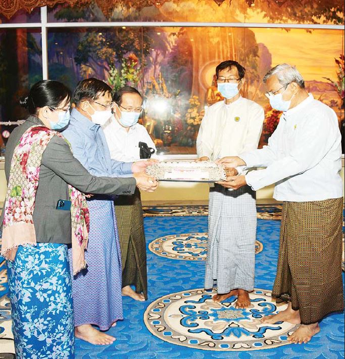 ယင်းနောက် နိုင်ငံတော်စီမံအုပ်ချုပ်ရေးကောင်စီဥက္ကဋ္ဌ နိုင်ငံတော်ဝန်ကြီးချုပ်နှင့် ဇနီးတို့သည် ဘုရားဂေါပကအဖွဲ့ထံအလှူငွေများ ပေးအပ်လှူဒါန်းပြီး ဘုရားဂေါပကအဖွဲ့က ဓမ္မလက်ဆောင် များ ပြန်လည်ပေးအပ်သည်။ ထို့နောက်နိုင်ငံတော်စီမံ အုပ်ချုပ်ရေးကောင်စီဥက္ကဋ္ဌ နိုင်ငံတော် ဝန်ကြီးချုပ်သည် ဧည့်သည်တော်မှတ်တမ်းစာအုပ်တွင် လက်မှတ်ရေးထိုး ပြီးစေတီတော် ကြီးအား လက်ယာရစ်လှည့်လည် ဖူးမြော်ကြည် ညိုခဲ့ပြီးနောက် ဘုရားဖူးလာရောက်သော ဒေသခံပြည်သူများအား ရင်းရင်းနှီးနှီး နှုတ်ဆက်စကားများ ပြောကြားခဲ့ကြောင်း သတင်းရရှိသည်။