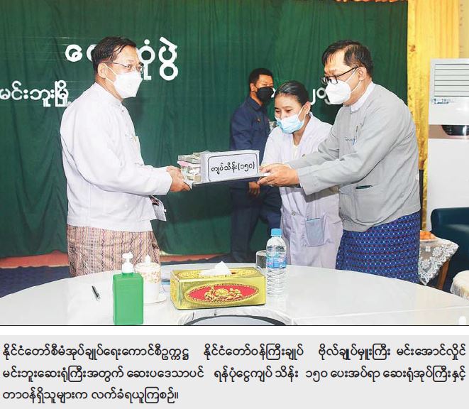 ယင်းနောက် နိုင်ငံတော်စီမံအုပ်ချုပ်ရေး ကောင်စီဥက္ကဋ္ဌ နိုင်ငံတော်ဝန်ကြီးချုပ်နှင့် အလှူရှင်များက ဆေးရုံကြီးအတွက် ဆေးပဒေသာပင် ရန်ပုံငွေကျပ်သိန်း ၁၅၀ နှင့် ကျန်းမာရေးဝန်ထမ်းများနှင့် လူနာများအတွက် စားသောက်ဖွယ်ရာများ ပေးအပ်ရာ ဆေးရုံအုပ်ကြီးနှင့် တာဝန်ရှိသူများက လက်ခံရယူကြသည်။
