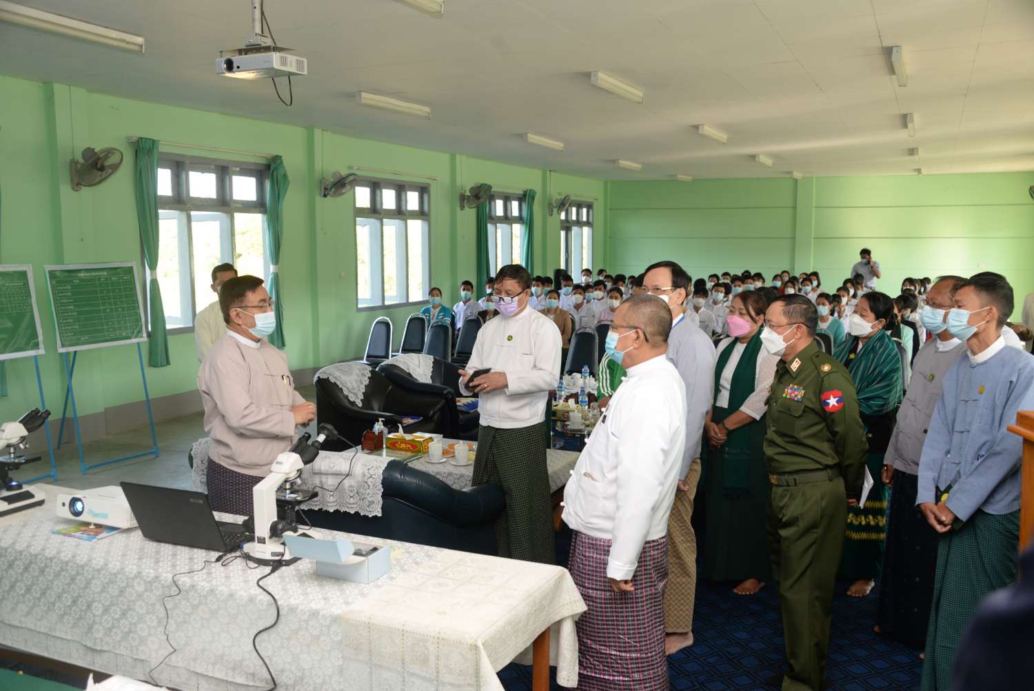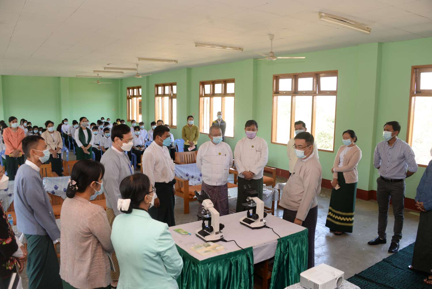 ယင်းနောက် ပြည်ထောင်စုဝန်ကြီးက ကျောင်းအုပ်ကြီးနှင့်ကျောင်းအကျိုးတော်ဆောင်များ၊ ဆရာဆရာမများနှင့် ကျောင်းသားကျောင်းသူများနှင့်တွေ့ဆုံ၍ ပညာရေးဝန်ကြီးဌာနအနေဖြင့် ကျောင်းများအတွက် အရည်အသွေးပြည့်မီသော သင်ထောက်ကူပစ္စည်းများ ဆက်လက်ဖြည့်ဆည်းပေးနိုင်ရေး စီစဉ်ဆောင်ရွက်လျက်ရှိပါကြောင်း၊ ကျောင်းသား ကျောင်းသူများ အနေဖြင့် သိပ္ပံဘာသာရပ်များ စာတွေ့လက်တွေ့ သင်ကြားရာတွင် အရည်အသွေးရှိသော သင်ထောက်ကူပစ္စည်းကို အသုံးပြုခြင်းဖြင့် ဘာသာရပ်ဆိုင်ရာသင်ခန်းစာများကို ပိုမိုနားလည် စေမည်ဖြစ်ပါကြောင်း၊ တန်ဖိုးကြီးသော သင်ထောက်ကူပစ္စည်းများကို တန်ဖိုးရှိစွာအသုံးချ သင်ကြားသင်ယူဆောင်ရွက်ကြစေ လိုပါကြောင်း၊ ဆရာဆရာမများအနေဖြင့် ကျောင်းသားကျောင်း သူများကို လက်တွေ့ခန်းသုံးပစ္စည်းများ ကျွမ်းကျင်စွာအသုံးပြုတတ်အောင် စေတနာထား သင်ကြား ပေးစေလိုပါကြောင်း၊ ကျောင်းသား ကျောင်းသူများအနေဖြင့် ကျန်းမာရေးဂရုစိုက်၍ ပညာကိုအမှန်တကယ်တတ်မြောက်ရန် ကြိုးစားသင်ယူစေလိုပါကြောင်း ပြောကြားသည်။