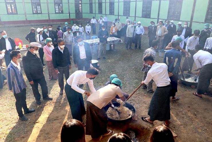 ထို့နောက် ပြည်ထောင်စုဝန်ကြီး နှင့်ဧည့်သည်တော်များသည် ပြည်ထောင်စု တိုင်းရင်းသားများ၏ ရိုးရာအစားအစာများဖြစ်သော ထမနဲ၊ ရှမ်းခေါက်ဆွဲ၊ မွန်သင်္ကြန် ထမင်း၊ မွန်ရိုးရာ ပီလောပီနံ နနွင်းမကင်း၊ ရခိုင်မုန့်တီ၊ မြိတ်ကတ်ကြေးကိုက်၊ ထားဝယ်ငှက်ပျောသီးပေါင်း၊ ချင်းရိုးရာငှက်ပျော ကြက်သားသုပ်၊ ချင်းရိုးရာသင်္ဘောသီးထောင်း၊ ချင်းရိုးရာခေါင်ရည် စသည့် အစားအသောက်များကို စိုက်ပျိုးရေးသိပ္ပံ ကျောင်းသား ကျောင်းသူများနှင့်အတူ လက်ရည်တစ်ပြင်တည်း တပျော်တပါး စားသုံးခဲ့ကြကြောင်း သိရသည်။