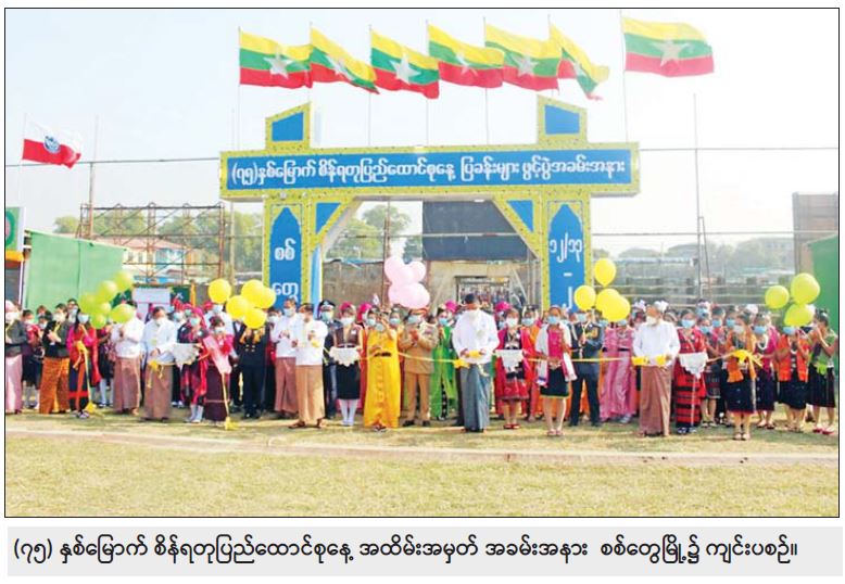 ထို့နောက် (၇၅)နှစ်မြောက် စိန်ရတု ပြည်ထောင်စုနေ့အထိမ်းအမှတ်အဖြစ် ဝန်ကြီးဌာနအလိုက် ဆောင်ရွက်လျက်ရှိသည့် ဒေသဖွံ့ဖြိုးရေး၊ လမ်းပန်းဆက်သွယ်မှု ကောင်းမွန်ရေး၊ ကျေးလက် ဒေသဖွံ့ဖြိုးတိုးတက်ရေး၊ လူမှုရေး၊ စီးပွားရေး၊ ပညာရေး၊ ကျန်းမာရေး၊ စိုက်ပျိုးမွေးမြူရေး၊ တိုင်းဒေသကြီးနှင့် ပြည်နယ်အတွင်း လျှပ်စစ်ဓာတ်အား ဖြန့်ဖြူးပေးမှုစသည့် ပြခန်းများ ကိုလည်းကောင်း၊ အားကစားပြိုင်ပွဲ များကိုလည်းကောင်း တာဝန်ရှိသူများနှင့် တက်ရောက်လာကြသူများက လိုက်လံကြည့်ရှုအားပေးကြသည်။