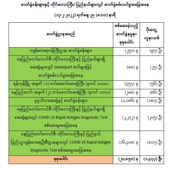 သို့ဖြစ်ပါ၍ ယနေ့အထိ ဓာတ်ခွဲနမူနာစုစုပေါင်း (၆,၆၈၉,၈၂၄) ခုအား စစ်ဆေးခဲ့ပြီး COVID-19 ဓာတ်ခွဲအတည်ပြုလူနာ စုစုပေါင်း (၅၄၆,၇၇၁) ဦး ရှိပြီဖြစ်ပါသည်။