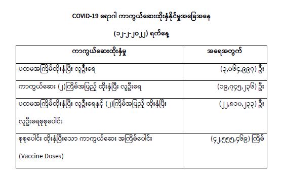 COVID-19 ရောဂါကာကွယ် ထိန်းချုပ်ရေးအတွက် တိုင်းဒေသကြီး/ ပြည်နယ်များတွင် COVID-19 ရောဂါကာကွယ်ဆေးကို ဦးတည်အုပ်စုများသတ်မှတ်၍ ထိုးနှံပေးလျက်ရှိရာ (၁၂-၂-၂၀၂၂) ရက်နေ့အထိ လူဦးရေစုစုပေါင်း (22,810,233) ဦးအား ထိုးနှံပေးပြီးဖြစ်၍ ကာကွယ်ဆေး နှစ်ကြိမ်အပြည့် ထိုးနှံပြီးစီးသူ (19,745,236) ဦးနှင့် ပထမအကြိမ် ထိုးနှံပြီးစီးသူ (3,064,997) ဦး ရှိပြီဖြစ်ပါသည်။ သို့ဖြစ်ပါ၍ (၁၂-၂-၂၀၂၂) ရက်နေ့အထိ မြန်မာနိုင်ငံတွင် COVID-19 ရောဂါကာကွယ်ဆေး အကြိမ်ရေ စုစုပေါင်း (42,555,469) ကြိမ် ထိုးနှံပြီး ဖြစ်ပါသည်။