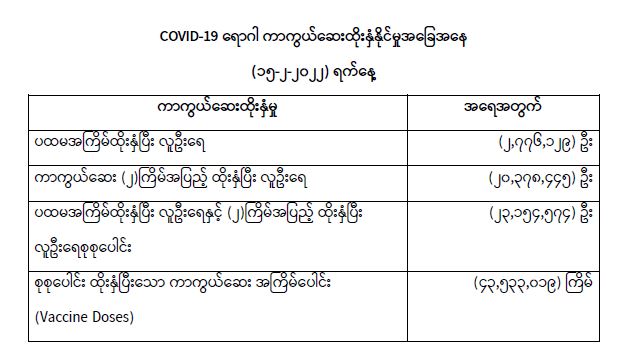 COVID-19 ရောဂါ ကာကွယ်ထိန်းချုပ်ရေးအတွက် တိုင်းဒေသကြီး/ ပြည်နယ်များတွင် COVID-19 ရောဂါကာကွယ်ဆေးကို ဦးတည်အုပ်စုများသတ်မှတ်၍ ထိုးနှံပေးလျက်ရှိရာ (၁၅-၂-၂၀၂၂) ရက်နေ့အထိ လူဦးရေ စုစုပေါင်း (၂၃,၁၅၄,၅၇၄) ဦးအား ထိုးနှံပေးပြီးဖြစ်၍ ကာကွယ်ဆေး နှစ်ကြိမ်အပြည့် ထိုးနှံပြီးစီးသူ (၂၀,၃၇၈,၄၄၅) ဦး နှင့် ပထမအကြိမ်ထိုးနှံပြီးစီးသူ (၂,၇၇၆,၁၂၉) ဦး ရှိပြီဖြစ်ပါသည်။ သို့ဖြစ်ပါ၍ (၁၅-၂-၂၀၂၂) ရက်နေ့အထိ မြန်မာနိုင်ငံတွင် COVID-19 ရောဂါကာကွယ်ဆေး အကြိမ်ရေ စုစုပေါင်း (၄၃,၅၃၃,၀၁၉) ကြိမ် ထိုးနှံပြီး ဖြစ်ပါသည်။