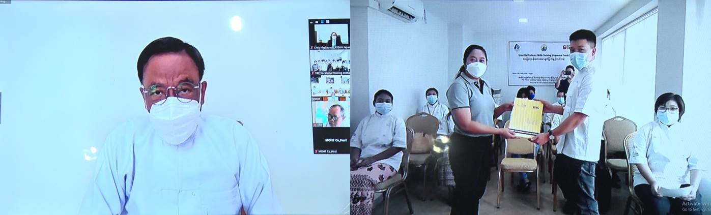 ဂျပန် အစားအစာချက်ပြုတ် ပြင်ဆင်မှုသင်တန်းဆင်းပွဲ (Japanese Culinary Training) ကို ယနေ့နံနက်ပိုင်းတွင် ဟိုတယ်နှင့်ခရီးသွားလာရေးဝန်ကြီးဌာန၌ Video Conferencing စနစ်ဖြင့် ကျင်းပသည်။
