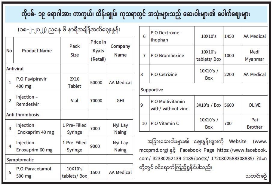 ကိုဗစ်- ၁၉ ရောဂါအား ကာကွယ်၊ ထိန်းချုပ်၊ ကုသရာတွင် အသုံးများသည့် ဆေးဝါးများ၏ ပေါက်ဈေးများ (၁၈-၂-၂၀၂၂) ညနေ ၆ နာရီအချိန်ထိဈေးနှုန်း 02/19/2022