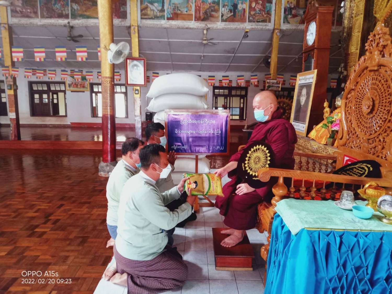 ထိုသို့ဆောင်ရွက်လျက်ရှိရာ ယနေ့တွင် နေပြည်တော်ကောင်စီနယ်မြေ ပုဗ္ဗသီရိမြို့နယ်ရှိ စိန်ရာဇာသာသနာ့လင်္ကာရ ပရိယတ္တိစာသင်တိုက် သို့လည်းကောင်း၊ ကချင်ပြည်နယ် မြစ်ကြီးနားမြို့နယ်ရှိ မြေမြင့်ကျောင်းတိုက်သို့လည်းကောင်း၊ စစ်ကိုင်းတိုင်းဒေသကြီး တမူးမြို့နယ်ရှိ သုခကာရီကျောင်းတိုက်သို့လည်းကောင်း၊ မန္တလေးတိုင်းဒေသကြီး မြင်းခြံမြို့နယ်ရှိ ချောင်းဒေါင်းပရိယတ္တိ စာသင်တိုက်သို့လည်းကောင်း၊ ရခိုင်ပြည်နယ် ကျောက်ဖြူမြို့နယ်ရှိ နဂါးကျောင်းပရိယတ္တိ စာသင်တိုက်သို့လည်းကောင်း၊ ရှမ်းပြည်နယ် ကျိုင်းတုံမြို့နယ်ရှိ ဓမ္မောဒယ ပရိယတ္တိ စာသင်တိုက်သို့လည်းကောင်း သွားရောက်၍ တာဝန်ရှိသူများက ဆရာတော်၊ သံဃာတော်များအတွက် ဆွမ်းဆန်တော်များကို ဆက်ကပ်လှူဒါန်း ခဲ့ကြကြောင်း သိရသည်။