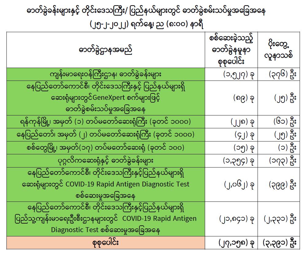 သို့ဖြစ်ပါ၍ ယနေ့အထိ ဓာတ်ခွဲနမူနာစုစုပေါင်း (၇,၀၅၆,၀၄၄)ခုအားစစ်ဆေးခဲ့ပြီး COVID-19 ဓာတ်ခွဲအတည်ပြုလူနာ စုစုပေါင်း (၅၈၁,၈၃၇) ဦး ရှိပြီဖြစ်ပါသည်။