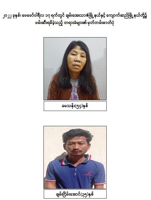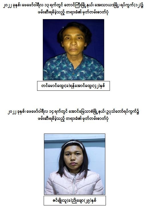 သို့ဖြစ်ပါ၍ ဖမ်းဆီးရမိ တရားခံများအား ဥပဒေအရ ထိရောက်စွာ အရေးယူနိုင်ရေး ဆက်လက်ဆောင်ရွက်သွားမည်ဖြစ်ပြီး အကြမ်းဖက်မှု ဆောင်ရွက်နေသူများအား ပြည်သူတစ်ရပ်လုံးက ဝိုင်းဝန်းကာကွယ် တိုက်ဖျက်ကြရန်နှင့် ပြစ်မှုကျူးလွန်ရာတွင် ပါဝင်ပတ်သက်သူများ၊ နောက်ကွယ်မှ ထောက်ပံ့ပေးလျက်ရှိသော ဆက်စပ်တရားခံများအား အမြန်ဆုံးဖမ်းဆီးရမိရေးအတွက် ၎င်းတို့ ပုန်းခိုရာနေရာများ၊ လှုပ်ရှားသွားလာနေထိုင်မှု သတင်းများရရှိပါက သက်ဆိုင်ရာသို့ လျှို့ဝှက်စွာ သတင်းပေးတိုင်ကြား နိုင်ပါကြောင်း၊ သတင်းပေးသူနှင့် ဖမ်းဆီးပေးသူ များအား ထိုက်တန်စွာ လျှို့ဝှက်၍ ဆုငွေများ ချီးမြှင့်ပေးမည်ဖြစ်ကြောင်းနှင့် မြို့ရွာများ အမြန်ဆုံးအေးချမ်း တည်ငြိမ်ရေးအတွက် ပြည်သူတစ်ရပ်လုံး ပူးပေါင်းပါဝင် ကြိုးပမ်းဆောင်ရွက်နိုင်ပါရန် မေတ္တာရပ်ခံအပ်ပါကြောင်း အသိပေး သတင်းထုတ်ပြန်အပ်ပါသည်။