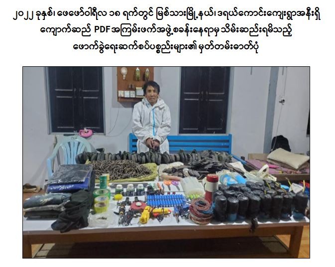 နိုင်ငံတော်မှ အကြမ်းဖက်အဖွဲ့အစည်းအဖြစ် သတ်မှတ်ထားသည့် CRPH၊ NUG နှင့် PDF အမည်ခံ အကြမ်းဖက်အဖွဲ့ဝင်များ မြို့/ရွာများတွင် လှုပ်ရှားသွားလာမှု မရှိစေရေး ဖော်ထုတ်ဖမ်းဆီးခြင်းများ ဆောင်ရွက်လျက်ရှိရာ ၂၀၂၂ ခုနှစ်၊ ဖေဖော်ဝါရီလ ၁၃ ရက်တွင် အေးချမ်းစွာနေထိုင်လိုသည့် တာဝန်သိပြည်သူများ၏ သတင်းပေးချက်အရ လုံခြုံရေးပူးပေါင်းအဖွဲ့သည် တောင်ကြီး မြို့နယ်၊ အေးသာယာမြို့၊ ရပ်ကွက်(၁၂)၊ အိမ်အမှတ်(၇၂)၌ ကျောက်ဆည် PDF အကြမ်းဖက်အဖွဲ့၏ ဘဏ္ဏာရေးနှင့် ညှိနှိုင်းရေးတာဝန်ခံ တင်မောင်ထွေး(ခ)ရန်အောင်ထွေး(၄၂)နှစ်အား လက်ကိုင်ဖုန်း ၈ လုံး၊ ငွေကျပ် ၉၀ သိန်း၊ ပြောက်ကျားဝတ်စုံ တို့နှင့်အတူ ဖမ်းဆီးရမိခဲ့သည်။