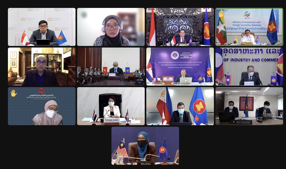 (၄၁)ကြိမ်မြောက် အာဆီယံစီးပွားရေး ပေါင်းစည်းမှုဆိုင်ရာ အဆင့်မြင့်လုပ်ငန်းအဖွဲ့ (41st Meeting of the High-level Task Force on ASEAN Economic Integration -HLTF-EI ) အစည်းအဝေးကို ယနေ့ နံနက်ပိုင်းတွင် ဗီဒီယိုကွန်ဖရင့်စနစ်ဖြင့် ကျင်းပရာ ရင်းနှီးမြှုပ်နှံမှုနှင့် နိုင်ငံခြားစီးပွားဆက်သွယ်ရေးဝန်ကြီးဌာန ဒုတိယဝန်ကြီး၊ မြန်မာနိုင်ငံ၏ အာဆီယံစီးပွားရေး ပေါင်းစည်းမှုဆိုင်ရာ အဆင့်မြင့်လုပ်ငန်းအဖွဲ့ဝင် ဦးသန်းအောင်ကျော်နှင့် တာဝန်ရှိသူများ တက်ရောက်ကြသည်။