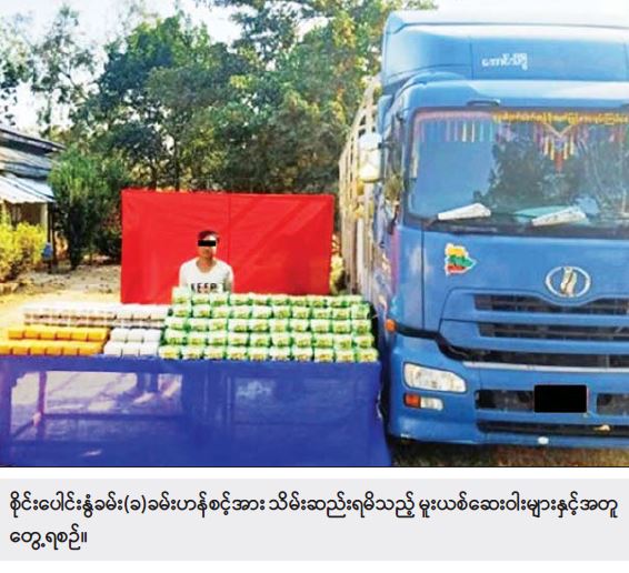 မူးယစ်ဆေးဝါး တားဆီးနှိမ်နင်းရေးရဲတပ်ဖွဲ့ဝင်များ ပါဝင်သော ပူးပေါင်းအဖွဲ့သည် ဖေဖော်ဝါရီ ၂၆ ရက် ညနေ ၃ နာရီခွဲတွင် ရှမ်းပြည်နယ်(တောင်ပိုင်း) ကွန်ဟိန်းမြို့နယ် တောင်ကြီး - တာချီလိတ်သွား ကားလမ်း တာကော်တံတား ပူးပေါင်းစစ်ဆေးရေးစခန်းတွင် ကာလိမှ မိုင်းပျဉ်း ဘက်သို့ စိုင်းပေါင်းနွံခမ်း (ခ) ခမ်းဟန်စင့်(၃၀)နှစ် မောင်းနှင်လာသည့် Nissan Diesel ၁၂ ဘီး ယာဉ်ကို သတင်းအရ ရှာဖွေရာ အိုက်စ် (မက်သ်အဖက်တမင်း) ကီလို ၁၅၀ နှင့် စိတ်ကြွရူးသွပ်ဆေးပြား ကိုးသိန်း သိမ်းဆည်းရမိခဲ့ပြီး သတင်းကွင်းဆက်အရ ၂၇ ရက် နံနက် ၁၀ နာရီတွင် ရှမ်းပြည်နယ် (အရှေ့ပိုင်း) မိုင်းပျဉ်းမြို့နယ် တောင်ကြီး -တာချီလိတ် သွားကားလမ်း မိုင်တိုင်အမှတ် (၂၈၄)အနီး ကားလမ်းဘေးတွင် ရပ်တန့်ထားသည့် Nissan Diesel ၁၂ ဘီးယာဉ်ကို စစ်ဆေးရှာဖွေရာ အိုက်စ် (မက်သ်အဖက်တမင်း) ကီလို ၄၀၀ ထပ်မံသိမ်းဆည်းရမိခဲ့သဖြင့် ဒေသကာလတန်ဖိုး ငွေကျပ် ၅ဒသမ ၅ ဘီလီယံကျော် တန်ဖိုးရှိ စုစုပေါင်း အိုက်စ်(မက်သ် အဖက်တမင်း) ၅၅၀ ကီလို၊ စိတ်ကြွရူးသွပ်ဆေးပြား ကိုးသိန်း သိမ်းဆည်းရမိခဲ့ကြောင်း၊ စစ်ဆေး ဖော်ထုတ်ချက်များအရ သိမ်းဆည်းရမိ မူးယစ်ဆေးဝါးများကို ရှမ်းပြည်နယ်(အရှေ့ပိုင်း) နယ်စပ်မှ တစ်ဆင့် ပြည်ပသို့ သယ်ဆောင်ခြင်းဖြစ်ကြောင်း သိရသဖြင့် ဥပဒေအရ အရေးယူထားရှိပြီး ကွင်းဆက်ပြစ်မှုကျူးလွန်သူများကို ဆက်လက်စစ်ဆေး ဖော်ထုတ်လျက်ရှိကြောင်း သိရသည်။