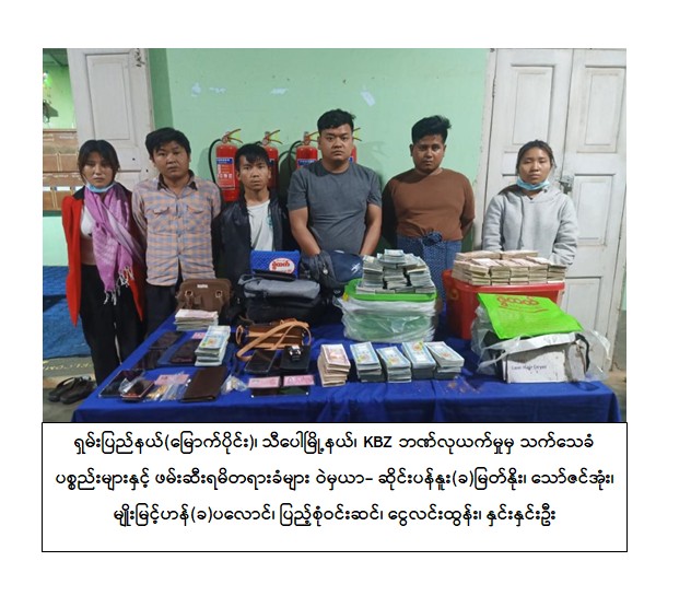 ရှမ်းပြည်နယ်(မြောက်ပိုင်း)၊ ကျောက်မဲမြို့နှင့် သီပေါမြို့နယ်တို့ရှိ ကမ္ဘောဇဘဏ်ခွဲ(၂)ခုအား သေနတ်ပြခြိမ်းခြောက်၍ လုယက်မှုကျူးလွန်ခဲ့သူ တရားခံများအား သက်သေခံပစ္စည်းများနှင့်အတူ ဖော်ထုတ်ဖမ်းဆီးရမိခဲ့ကြောင်း သိရသည်။