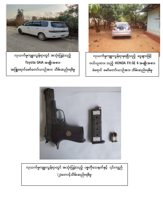 အထက်ပါလုယက်မှုဖြစ်စဉ်(၂)ခုမှ ကျူးလွန်သူ တရားခံ အမျိုးသား ၅ ဦး၊ အမျိုးသမီး ၂ ဦးနှင့် သက်သေခံပစ္စည်းများ ဖြစ်သည့် ငွေကျပ် ၁၂၂၀ သိန်း၊ ရွှေဆွဲကြိုး ၃ ကုံး၊ ရွှေလက်စွပ် တစ်ကွင်း၊ ရွှေဆွဲသီး တစ်ခု၊ လက်ကိုင်ဖုန်း ၅ လုံး၊ Tablet ၁ လုံး၊ ရွှေဘောက်ချာ ၆ ရွက်နှင့် ငွေစုဘဏ်စာအုပ် ၂ အုပ်၊ လုယက်မှုကျူးလွန်စဉ် အသုံးပြုခဲ့သည့် ပစ္စတိုသေနတ်တစ်လက်၊ ၎င်းကျည် ၂ တောင့်၊ Toyota GAIA အမျိုးအစား အဖြူရောင် မော်တော်ယာဉ် ၁ စီးနှင့် လုယက်မှုကျူးလွန်ရာမှရရှိသည့် ငွေများဖြင့် ဝယ်ယူထားသည့် HONDA Fit GE 6 အမျိုးအစား ခဲရောင်မော်တော်ယာဉ် ၁ စီးတို့အား ဖော်ထုတ်သိမ်းဆည်းရမိခဲ့ကာ ကျန်ရှိသည့် သက်သေခံပစ္စည်းများအား ဆက်လက်စစ်ဆေး ဖော်ထုတ်သိမ်းဆည်း၍ တရားခံများအား ဥပဒေနှင့်အညီ ထိရောက်စွာ အရေးယူနိုင်ရေး ဆက်လက်ဆောင်ရွက်လျက်ရှိကြောင်း သတင်းထုတ်ပြန်အပ်ပါသည်။