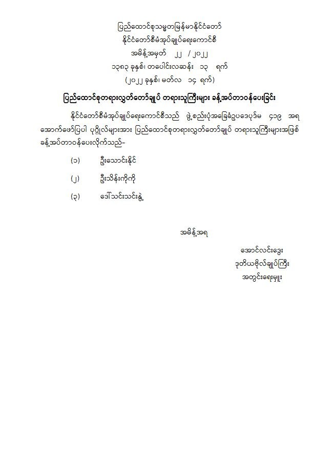 ပြည်ထောင်စုသမ္မတမြန်မာနိုင်ငံတော် နိုင်ငံတော်စီမံအုပ်ချုပ်ရေးကောင်စီ အမိန့်အမှတ် ၂၂ / ၂၀၂၂ ၁၃၈၃ ခုနှစ်၊ တပေါင်းလဆန်း ၁၃ ရက် (၂၀၂၂ ခုနှစ်၊ မတ်လ ၁၄ ရက်) ပြည်ထောင်စုတရား လွှတ်တော်ချုပ် တရားသူကြီးများ ခန့်အပ်တာဝန်ပေးခြင်း