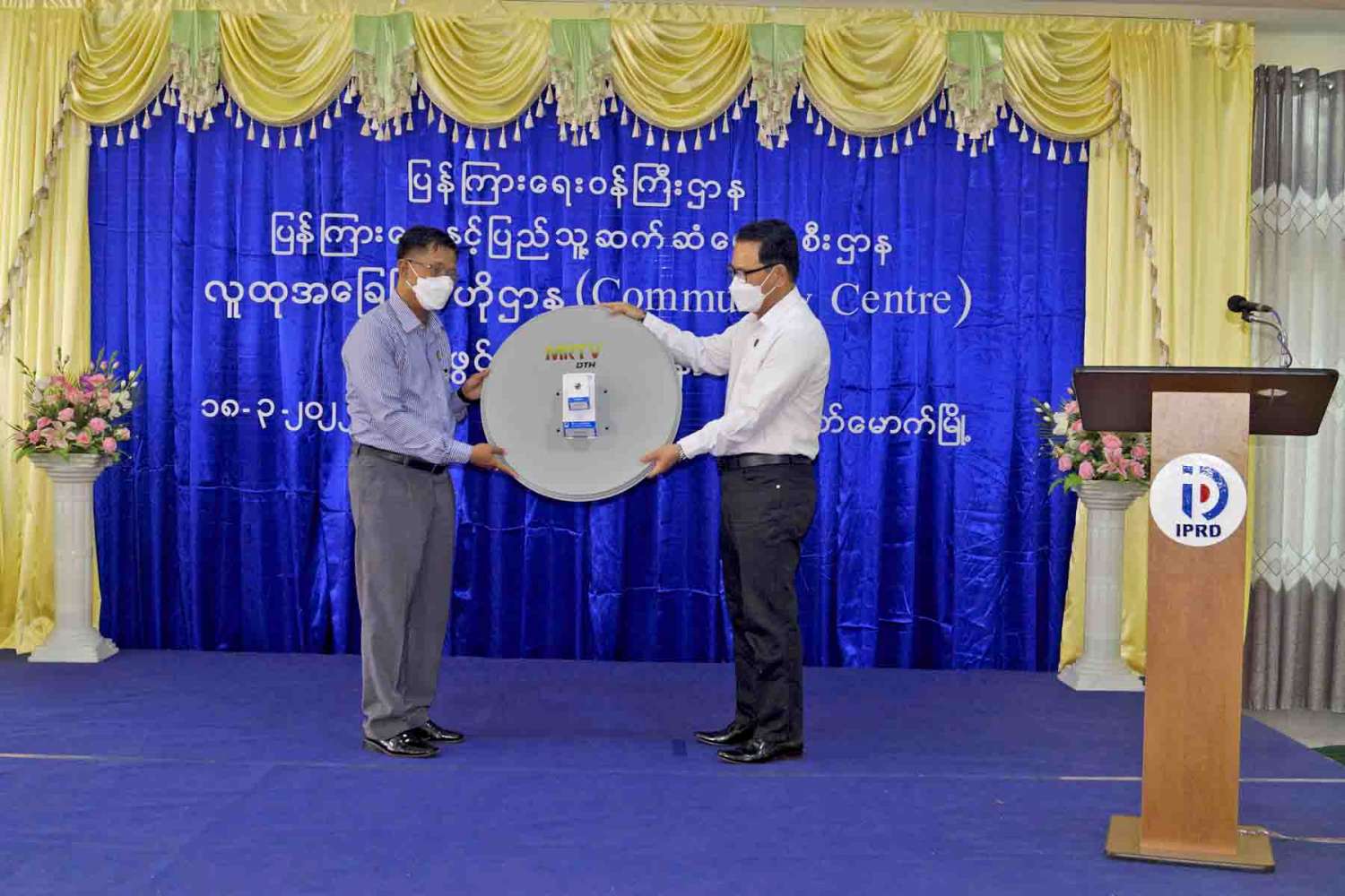 ဆက်လက်၍ ပြည်ထောင်စုဝန်ကြီး ဦးမောင်မောင်အုန်းက မြန်မာ့အသံနှင့် ရုပ်မြင်သံကြားက ထုတ်လွှင့်ပေးလျက်ရှိသည့် အစီအစဉ်များကို ပြည်သူများ ဖမ်းယူကြည့်ရှုနိုင်ရန်အတွက် MRTV DVB –T2 Set Top Box အလုံးရေ ၁၀၀၀ ကို ပေးအပ်လှူဒါန်းရာ တိုင်းဒေသကြီး လူမှုရေးရာ ဝန်ကြီးက လက်ခံရယူသည်။