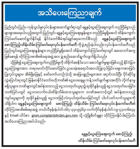 အကောက်ခွန်ဦးစီးဌာနက မဟာသင်္ကြန်ရုံးပိတ်ရက်ကာလအတွင်း လုပ်ငန်းများ အဆင်ပြေချောမွေ့အောင် ဆောင်ရွက်ပေးမည်ဖြစ်ကြောင်း အသိပေးကြေညာချက်