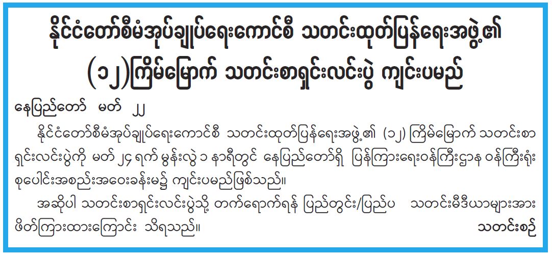 နိုင်ငံတော်စီမံအုပ်ချုပ်ရေးကောင်စီ သတင်းထုတ်ပြန်ရေးအဖွဲ့၏ (၁၂)ကြိမ်မြောက် သတင်းစာ ရှင်းလင်းပွဲ ကျင်းပမည် 03/23/2022 နိုင်ငံတော်စီမံအုပ်ချုပ်ရေးကောင်စီ သတင်းထုတ်ပြန်ရေးအဖွဲ့၏ (၁၂)ကြိမ်မြောက် သတင်းစာ ရှင်းလင်းပွဲ ကျင်းပမည်