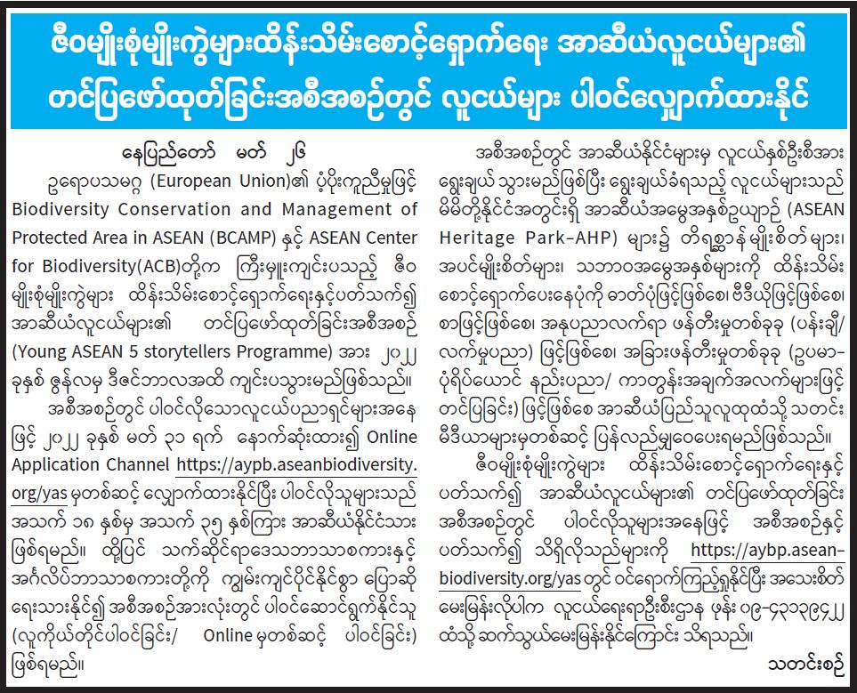 ဇီဝမျိုးစုံမျိုးကွဲများ ထိန်းသိမ်းစောင့်ရှောက်ရေး အာဆီယံလူငယ်များ၏ တင်ပြဖော်ထုတ်ခြင်း အစီစဉ်တွင် လူငယ်များ ပါဝင်လျှောက်ထားနိုင် 03/27/2022