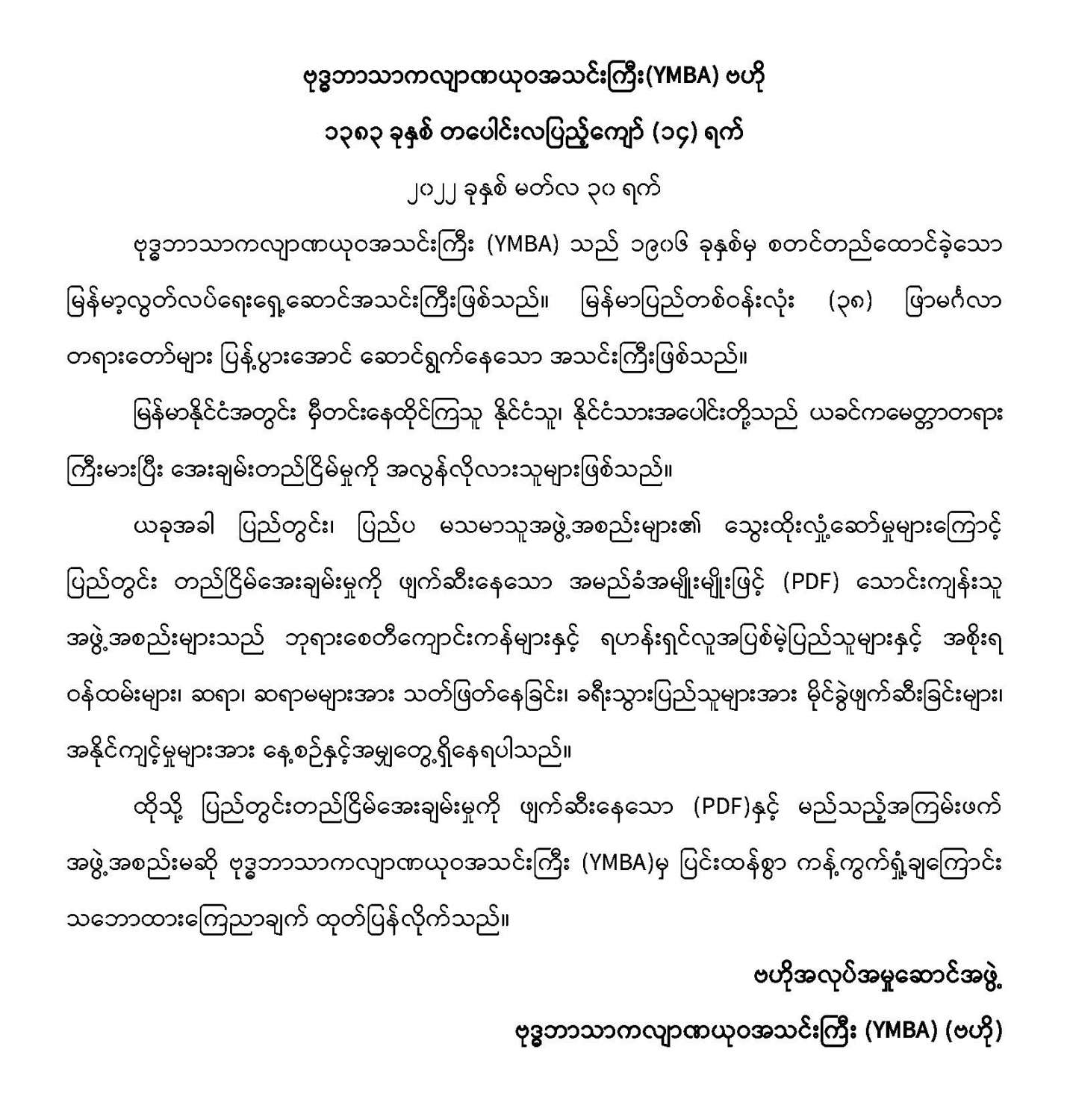 ပြည်တွင်းတည်ငြိမ်အေးချမ်းမှုကို ဖျက်ဆီးနေသော PDF အမည်ခံ သောင်းကျန်းသူများ၏ အကြမ်းဖက် လုပ်ရပ်များကို ပြင်းထန်စွာကန့်ကွက်ရှုတ်ချကြောင်း ဗုဒ္ဓကလျာဏယုဝအသင်းကြီး (YMBA)(ဗဟို)က သဘောထားထုတ်ပြန် 03/30/2022