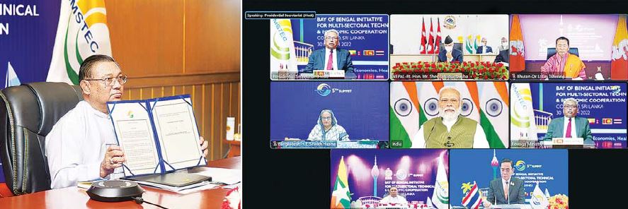 ယင်းနောက် ပဉ္စမအကြိမ်မြောက် ဘင်းမ်စတက်ထိပ်သီးအစည်း အဝေးသို့ ဗီဒီယိုကွန်ဖရင့် စနစ်ဖြင့် တက်ရောက်သည့် အဖွဲ့ဝင်နိုင်ငံအကြီး အကဲများက ဘင်းမ်စတက်ပ ဋိညာဉ်စာတမ်းကို လက်မှတ်ရေးထိုးကြ ပြီး လက်မှတ်ရေးထိုးထားသည့် စာမျက်နှာကို တီဗွီဖန်သားပြင်တွင် ပြသသည်။ နိုင်ငံခြားရေးဝန်ကြီးဌာန ပြည်ထောင်စုဝန်ကြီးက နိုင်ငံတော်စီမံအုပ်ချုပ်ရေး ကောင်စီ ဥက္ကဋ္ဌ နိုင်ငံတော်ဝန်ကြီးချုပ် ဗိုလ်ချုပ်မှူးကြီးမင်းအောင်လှိုင် လက်မှတ်ရေးထိုး ထားသည့် စာမျက်နှာကို အခြားအဖွဲ့ဝင်နိုင်ငံများမှ အကြီးအကဲများ ပြသချိန်တွင် တစ်ပြိုင်တည်း ပြသခဲ့သည်။