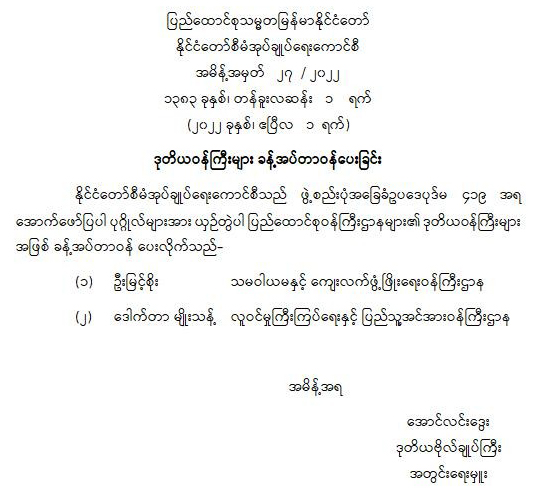 နေပြည်တော်စည်ပင်သာယာရေးကော်မတီ ဒုတိယဥက္ကဋ္ဌ၊ ဒုတိယမြို့တော်ဝန် ပူးတွဲတာဝန်ပေးအပ်ခြင်း