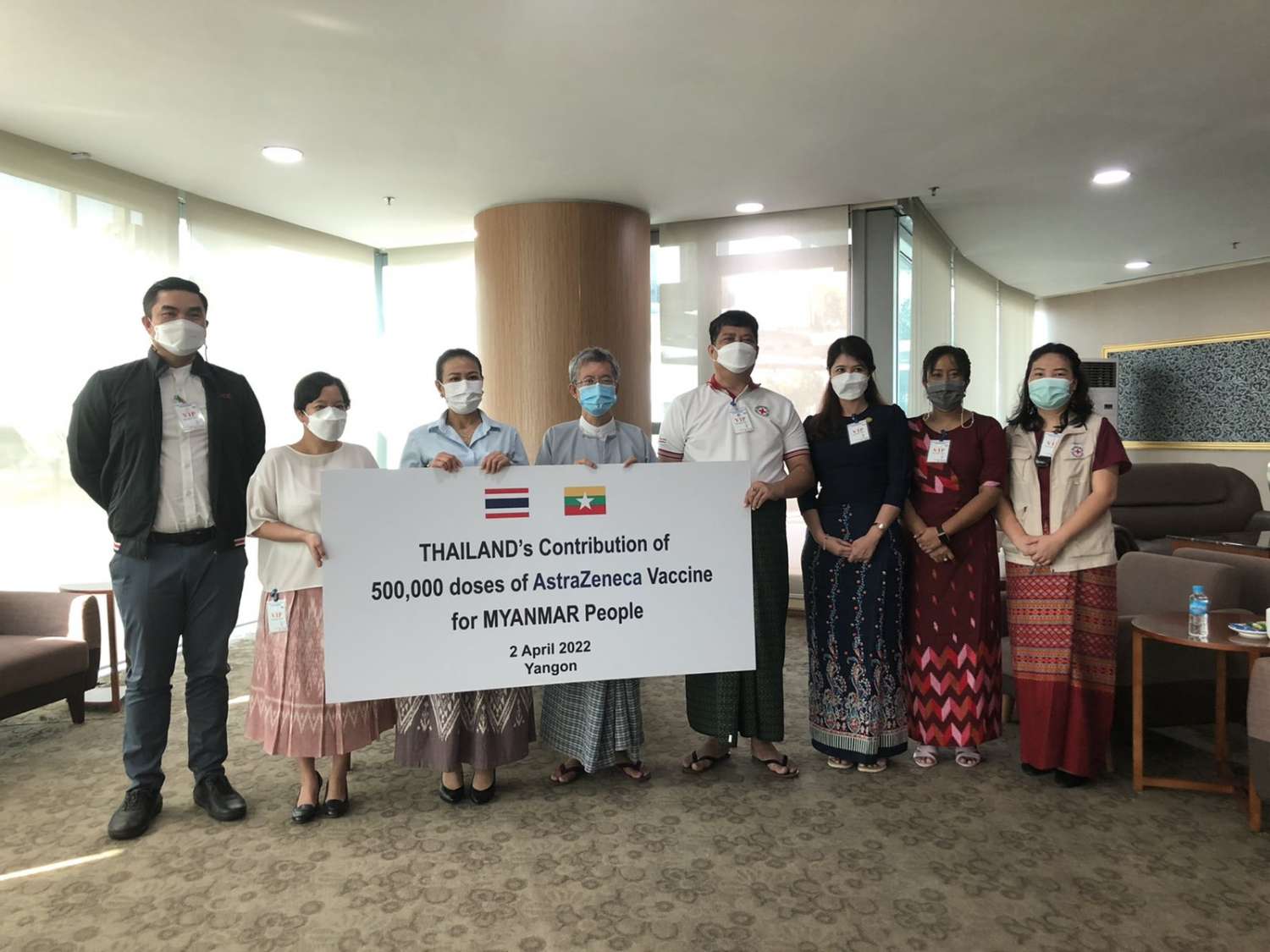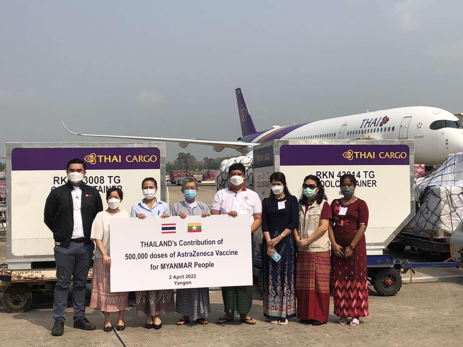 ကိုဗစ်-၁၉ ရောဂါကာကွယ်ဆေးထိုးလုပ်ငန်းများတွင် အသုံးပြုရန် ထိုင်းနိုင်ငံမှ မြန်မာနိုင်ငံ ပြည်သူများသို့ လှူဒါန်းသည့် ကိုဗစ်-၁၉ ကာကွယ်ဆေး AstraZeneca အမှတ်တံဆိပ် (၁)သန်း doses အနက် ဒုတိယအသုတ် ကာကွယ်ဆေး(၅)သိန်း Doses နှင့် ဆေးထိုးအပ် (၅)သိန်းတို့သည် Thai Airways လေယာဉ်ဖြင့် ရန်ကုန်အပြည်ပြည်ဆိုင်ရာ လေဆိပ်သို့ ယနေ့ နံနက် ၉ နာရီ ၁၅ မိနစ်တွင် ရောက်ရှိလာရာ အဆိုပါ ကာကွယ်ဆေးများနှင့် ဆေးထိုးအပ်များကို မြန်မာနိုင်ငံ ကြက်ခြေနီအသင်းသို့ လွှဲပြောင်းပေးအပ်ပွဲကို ရန်ကုန် အပြည်ပြည်ဆိုင်ရာလေဆိပ် ဧည့်ခန်းမဆောင်၌ ပြုလုပ်သည်။