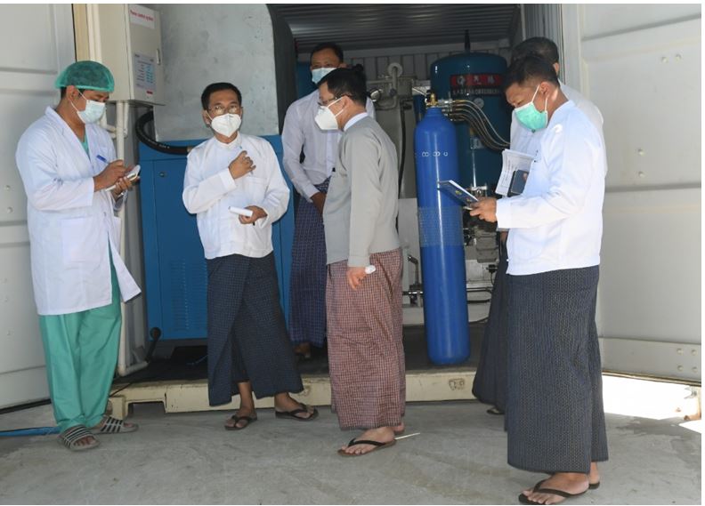 မွန်းလွဲပိုင်းတွင် ပြည်ထောင်စုဝန်ကြီးနှင့် တာဝန်ရှိသူများသည် လှိုင်သာယာမြို့နယ်ရှိ သုခစုစံဝန်ဆောင်မှု ကုမ္ပဏီ၏ စက်မှုလက်မှုကျွမ်းကျင်လုပ်သား သင်တန်းကျောင်းတွင် Electrical သင်တန်းဖွင့်လှစ်ပို့ချနေမှုနှင့် အခြားသင်တန်းများ၏ စာတွေ့လက်တွေ့ သင်ကြားပို့ချမှုများကို ကြည့်ရှုစစ်ဆေး အားပေးသည်။ ယင်းနောက် လူမှုဖူလုံရေးအဖွဲ့ပိုင် အလုပ်သမား ဆေးရုံကြီး (ထန်းတပင်)သို့ သွားရောက်၍ ကိုဗစ်-၁၉ အတည်ပြုလူနာများ ထားရှိကုသရန် တိုးချဲ့ ပြင်ဆင်ထားရှိမှုများ၊ ကိုဗစ်-၁၉ စောင့်ကြည့်လူနာများထားရှိမည့် ကုသဆောင်များ၊ ကိုဗစ်-၁၉ ပြင်းထန်အဆုတ်ရောင်လူနာများ ဆေးကုသရာတွင် လိုအပ်သော အောက်ဆီဂျင်ကို လုံလောက်စွာ ရရှိနိုင်ရန် Oxygen Generating Plant(20 Nm3/h) (Containerized) ဖြင့် ဝန်ဆောင်မှု ဆောင်ရွက်ပေးနေမှုများကို လှည့်လည်စစ်ဆေးပြီး လိုအပ်သည်များ မှာကြားခဲ့ကြောင်း သိရသည်။