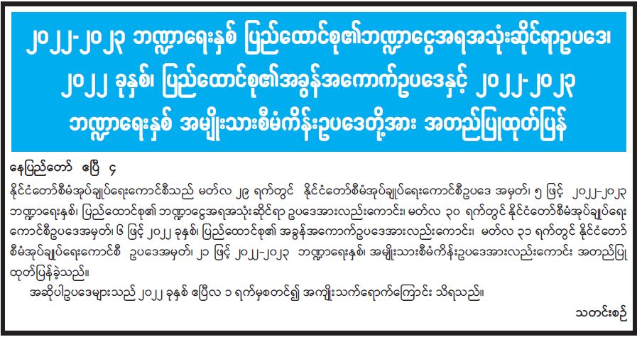 ၂၀၂၂-၂၀၂၃ ဘဏ္ဍာရေးနှစ် ပြည်ထောင်စု၏ဘဏ္ဍာငွေအရအသုံးဆိုင်ရာ ဥပဒေ၊ ၂၀၂၂ ခုနှစ်၊ ပြည်ထောင်စု၏ အခွန်အကောက်ဥပဒေနှင့် ၂၀၂၂-၂၀၂၃ ဘဏ္ဍာရေးနှစ် အမျိုးသားစီမံကိန်းဥပဒေတို့အား အတည်ပြုထုတ်ပြန် 04/05/2022