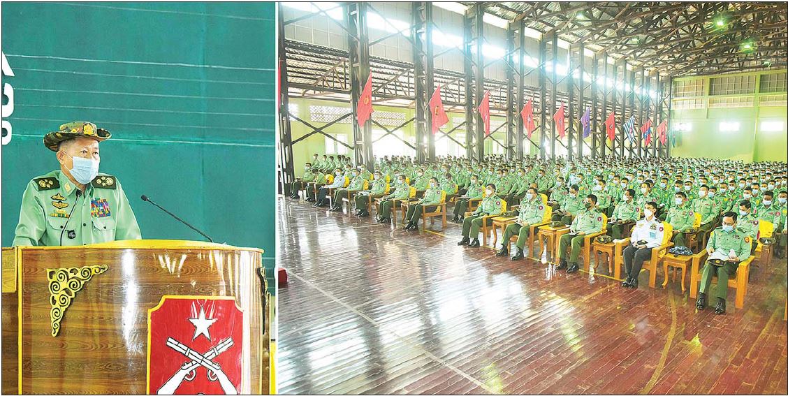 ထို့နောက် သင်တန်းခန်းမ ရှင်းလင်းဆောင်၌ တပ်မတော်(ကြည်း)အရာခံနှင့် အကြပ်ကြီးသင်ကျောင်း ကျောင်းအုပ်ကြီး က တပ်တည်ဆောင်ရေးလုပ်ငန်းကြီး(၄)ရပ် အကောင်အထည်ဖော် ဆောင်ရွက်ထားရှိမှုနှင့် လေ့ကျင့်ရေးဆိုင်ရာ ကိစ္စရပ်များနှင့် ပတ်သက်၍ ရှင်းလင်းတင်ပြရာ နိုင်ငံတော်စီမံအုပ်ချုပ်ရေးကောင်စီ ဒုတိယဥက္ကဋ္ဌ ဒုတိယတပ်မတော် ကာကွယ်ရေးဦးစီချုပ်၊ ကာကွယ်ရေးဦးစီချုပ်(ကြည်း) က လိုအပ်သည်များ ပေါင်းစပ်ညှိနှိုင်း ဆောင်ရွက်ပေးသည်။