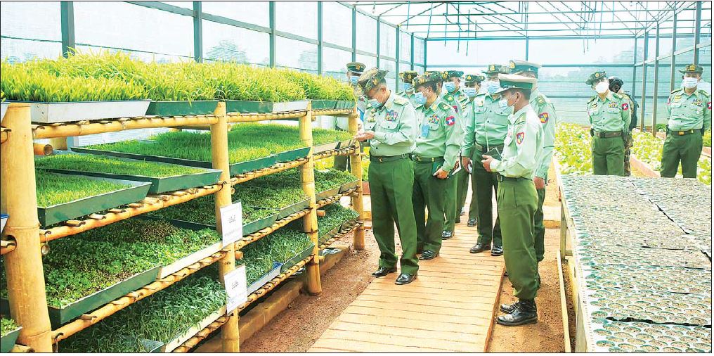 ထို့နောက် နိုင်ငံတော်စီမံအုပ်ချုပ်ရေးကောင်စီ ဒုတိယဥက္ကဋ္ဌ ဒုတိယတပ်မတော်ကာကွယ်ရေး ဦးစီးချုပ် ကာကွယ်ရေးဦးစီးချုပ်(ကြည်း) နှင့် အဖွဲ့ဝင်များသည် တိရစ္ဆာန်မွေးမြူရေးနှင့် လေ့ကျင့်ရေးတပ်ရင်းရှိ စံပြစိုက်ပျိုးမွေးမြူရေးဇုန် စုစုပေါင်း ၅၅ ဧက တည်ဆောက်ထားရှိမှု အခြေအနေ၊ ရာသီသီးနှံနှင့် မြေအစားထိုးသီးနှံ စိုက်ပျိုးထားရှိမှု၊ Green House အတွင်း စိုက်ပျိုးထားရှိမှုနှင့် ကျောက်စိမ်း တစ်သျှူးငှက်ပျော (သီးမွှေး) စိုက်ပျိုး ထားရှိမှု၊ DYL မျိုးမြင့် သားပေါက်ဝက်များနှင့် မြေစိုက်ရေခံ အဆောက်အဦနှင့် လေလုံအအေးပေး အဆောက်အဦအတွင်း ဥစားကြက်များ မွေးမြူထား ရှိမှု၊ နို့စားနွားနှင့် အသားတိုးနွားများ မွေးမြူထားရှိမှု၊ လား၊ မြည်းမွေးမြူထားရှိမှုတို့ကို လှည့်လည် ကြည့်ရှုစစ်ဆေးပြီး တာဝန်ရှိသူများအား စိုက်ပျိုး မွေးမြူရေးလုပ်ငန်းများ ဆောင်ရွက်ရာတွင် အမှန်တကယ် အောင်မြင်ဖြစ်ထွန်းအောင် လုပ်ဆောင်ကြရန်၊ နိုင်ငံတော်စီမံအုပ်ချုပ်ရေး ကောင်စီဥက္ကဋ္ဌ နိုင်ငံတော်ဝန်ကြီးချုပ် လမ်းညွှန်ချက်အတိုင်း စိုက်ပျိုးမွေးမြူရေးလုပ်ငန်းများမှ ထွက်ရှိသည့် ထုတ် ကုန်အသား၊ ငါး၊ အသီးအရွက်များအား တပ်ရင်း/တပ်ဖွဲ့များရှိ အရာရှိ၊ စစ်သည်၊ မိသားစုများ ပြင်ပ ပေါက်ဈေးထက် သက်သာသောဈေးနှုန်းများဖြင့် လုံလောက်ဖူလုံစွာ ရရှိနိုင်ရန်နှင့် ပိုလျှံပါက နိုင်ငံ့ဝန်ထမ်းများနှင့် ဒေသခံပြည်သူများ၏ သက်သာ ချောင်ချိရေးအတွက် သက်သာသော ဈေးနှုန်းများဖြင့် ရောင်းချရန်၊ စံပြစိုက်ပျိုးမွေးမြူရေးဇုန် ဖြစ်သည်နှင့်အညီ ဒေသတွင်းစံပြဖြစ်အောင်နှင့် အောင်မြင်ဖြစ်ထွန်းအောင် ရည်မှန်းချက်ထား၍ မရပ်မနား ကြိုးပမ်းဆောင်ရွက်သွားရန် မှာကြားခဲ့ကြောင်း သတင်းရရှိသည်။