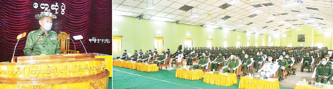 ထို့နောက် နိုင်ငံတော်စီမံအုပ်ချုပ်ရေး ကောင်စီဒုတိယဥက္ကဋ္ဌ ဒုတိယတပ်မတော် ကာကွယ်ရေးဦးစီးချုပ်၊ ကာကွယ်ရေးဦးစီးချုပ်(ကြည်း)သည် ခြေလျင်တပ်ရင်းမှူး၊ တပ်ခွဲမှူး၊ တပ်စုမှူး သင်တန်းသား အရာရှိများအား တပ်မတော်(ကြည်း) တိုက်ခိုက်ရေးကျောင်း(ဗထူး) အောင်ဆန်းခန်းမ၌ တွေ့ဆုံ၍ အမှာစကားပြောကြားရာတွင် သစ္စာ(၄)ချက်ကို နေ့စဉ်သစ္စာပြု၍ ၂၄ နာရီ တာဝန်ထမ်းဆောင်နေသည့် တပ်မတော်သားဖြစ်သည်ကို မမေ့မလျော့ သတိပြုရန်လိုကြောင်း၊ နိုင်ငံတော်နှင့် တပ်မတော်၏သစ္စာကို စောင့်သိရန်နှင့် အသက်ခန္ဓာကို စွန့်လွှတ်ရန် သစ္စာဆိုထားသူများဖြစ်ပြီး နိုင်ငံတော်ကာကွယ်ရေးတာဝန်ကို ဦးလည်မသုန် ထမ်းရွက်နေမှုအပေါ် ဂုဏ်ယူနေရန်လိုကြောင်း၊ တပ်မတော်သို့ စတင်ဝင်ရောက်ပြီး နိုင်ငံတော်အလံအား လက်နှင့်ထိ၍ ကတိသစ္စာပြုခဲ့ချိန်မှစတင်ကာ ၂၄ နာရီ အချိန်ပြည့် နိုင်ငံတော်ကာကွယ်ရေးတာဝန် ထမ်းဆောင်ရန် တာဝန်ရှိခဲ့ကြပြီး မိမိနှင့် မိမိတို့၏ မိသားစုဝင်များ၏ စားရေး၊ ဝတ်ရေး၊ နေရေး၊ ကျန်းမာရေး၊ ပညာရေး၊ သွားလာရေးမှစ၍ ခံစားနေရမူသည် နိုင်ငံတော်နှင့် တပ်မတော်မှ ထောက်ပံ့မှုများဖြစ်ကြောင်း၊ ထိုထောက်ပံ့ငွေများသည်လည်း မိမိတို့အပါအဝင် ပြည်သူများမှ သတ်မှတ်ထည့်ဝင်ကြရသည့် အခွန်များမှ နိုင်ငံ့ဝန်ထမ်းများအတွက် ပြန်လည်ချီးမြှင့် ထောက်ပံ့ခြင်းဖြစ်၍ နိုင်ငံတော်နှင့် ပြည်သူအပေါ် ကျေးဇူးသစ္စာ စောင့်သိရန်လိုကြောင်း၊ တပ်မတော်အနေဖြင့် ၂၀၀၈ ခုနှစ်၊ ဖွဲ့စည်းပုံအခြေခံဥပဒေအရ အရေးပေါ်ကာလပြဋ္ဌာန်းချက်တို့နှင့်အညီ ပြည်သူကရွေးချယ်ထားသည့် ပါတီစုံဒီမိုကရေစီစနစ်အား တိမ်းစောင်းမှုမရှိစေရေး နိုင်ငံတော်၏တာဝန်ကို ခေတ္တထိန်းသိမ်း ဆောင်ရွက်လျက်ရှိကြောင်း၊ ထိုသို့ဆောင်ရွက်ရာတွင် နိုင်ငံတော်တည်ငြိမ်ရေးနှင့် တရားဥပဒေစိုးမိုးရေးကို အလေးထားဆောင်ရွက်နေရသဖြင့် ခက်ခဲပင်ပန်းမှုများရှိနိုင်၍ နိုင်ငံတော်နှင့် ပြည်သူ၏မျက်နှာကိုကြည့်ကာ မဆုတ်မနစ်သော ဇွဲ၊ လုံ့လ၊ ဝီရိယတို့ဖြင့် ဆက်လက်ကြိုးစား လုပ်ကိုင်ကြရန်လိုကြောင်း၊ ထိုသို့နိုင်ငံ့အရေးများကို ကျရာကဏ္ဍမှ တာဝန်ကျေပွန်စွာ ထမ်းဆောင်ရာတွင် သင်ကြားလေ့ကျင့်ပေးသည့် သင်ခန်းစာများကို Professional ကျကျ လက်တွေ့အသုံးချနိုင်သည်အထိ လေ့လာသင်ယူရန်လိုကြောင်း၊ သို့မှသာ ပြည်သူလူထု၏ အသက်အိုးအိမ်စည်းစိမ်ကို လုံခြုံစွာ ကာကွယ်စောင့်ရှောက် နိုင်မည်ဖြစ်ကြောင်း၊ နိုင်ငံတော်လုံခြုံရေးကဏ္ဍသည် ကျယ်ပြန့်ပြီး နိုင်ငံရေး၊ စီးပွားရေး၊ လူမှုရေး၊ မျိုးချစ်စိတ်ဓာတ်မှစ၍ အချုပ်အခြာအာဏာအထိ သက်ဆိုင်၍ ပေါ့ပေါ့ဆဆ မလုပ်ရန်လိုကြောင်း၊ ထိုသို့ကြီးလေးသော လုပ်ငန်းတာဝန်များ ထမ်းဆောင်နိုင်ရန် တပ်မ