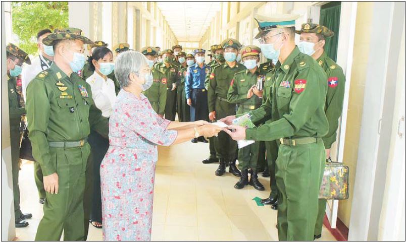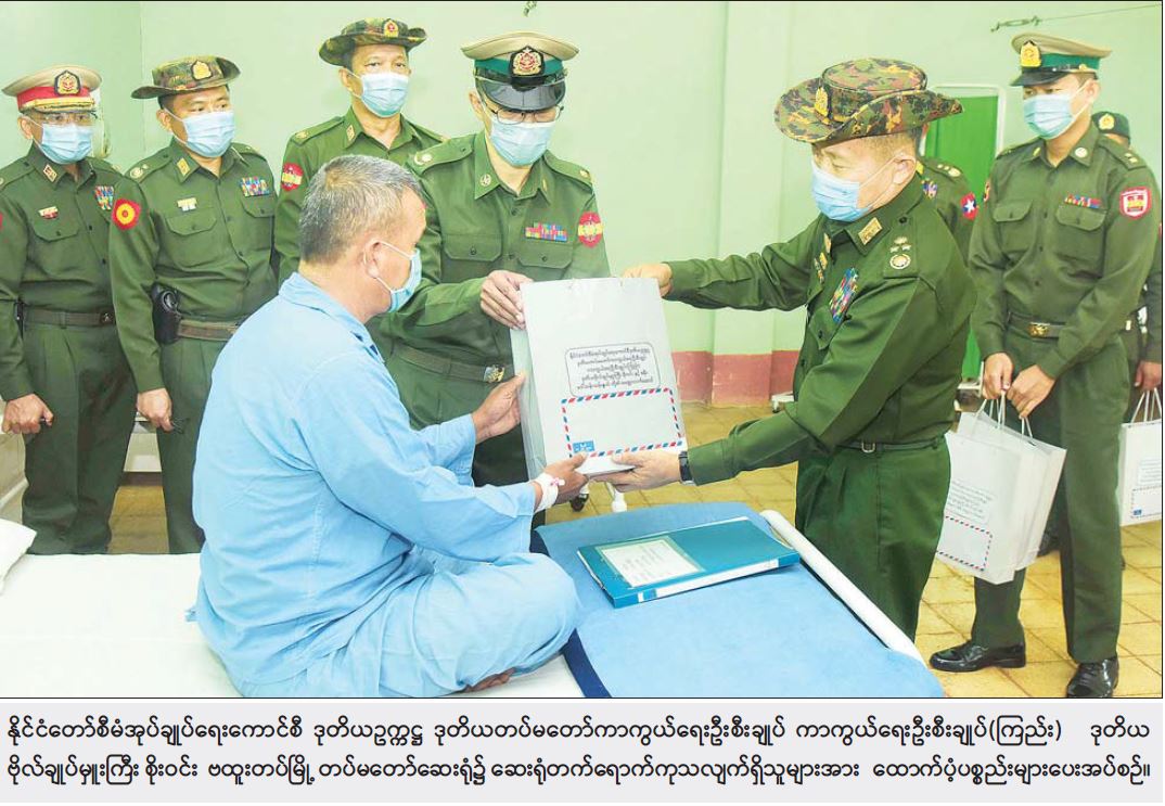 ထို့နောက် နိုင်ငံတော်စီမံ အုပ်ချုပ်ရေးကောင်စီ ဒုတိယဥက္ကဋ္ဌ ဒုတိယတပ်မတော် ကာကွယ်ရေးဦးစီးချုပ် ကာကွယ် ရေးဦးစီးချုပ်(ကြည်း)နှင့် အဖွဲ့ဝင်များသည် ဆေးရုံတက်ရောက် ဆေးကုသမှု ခံယူလျက်ရှိသည့် အရာရှိ၊ စစ်သည်၊ မိသားစုများနှင့် ဒေသခံပြည်သူများအား လိုက်လံကြည့်ရှုပြီး တစ်ဦးချင်း၏ ရောဂါအခြေအနေများအား မေးမြန်းအားပေးစကား ပြော ကြားကာ စားသောက်ဖွယ်ရာများ ပေးအပ်သည်။