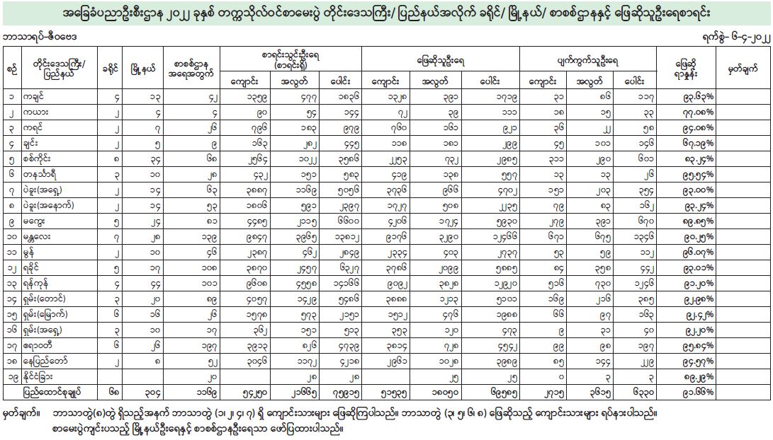 ယခုနှစ်တွင် နိုင်ငံခြားစာစစ်ဌာန ၂၀ နှင့် ပြည်တွင်း၌ စာစစ်ဌာန ၁၁၄၉ ခု၊ စာစစ်ဌာနစုစုပေါင်း ၁၁၆၉ ခု ဖွင့်လှစ်ဖြေဆိုခဲ့ရာ ဇီဝဗေဒဘာသာရပ်စာမေးပွဲဖြေဆိုရန် စာရင်းပေးသွင်းသူဦးရေ စုစုပေါင်း ၇၅၉၁၅ ဦးရှိပြီး စာမေးပွဲဆဋ္ဌမနေ့ ဇီဝဗေဒဘာသာရပ် လာရောက်ဖြေဆိုသူ စုစုပေါင်း ၆၉၅၈၅ ဦးရှိကာ ဖြေဆိုသူရာခိုင်နှုန်း ၉၁ ဒသမ ၆၆ ရာခိုင်နှုန်းရှိကြောင်း ပညာရေးဝန်ကြီးဌာနမှ သိရသည်။