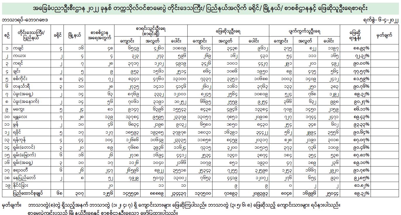 ၂၀၂၂ ခုနှစ် တက္ကသိုလ်ဝင်စာမေးပွဲ ဆဋ္ဌမနေ့ကို ယနေ့နံနက်ပိုင်းတွင် ကျင်းပရာ တစ်နိုင်ငံလုံးအတိုင်းအတာဖြင့် ဘောဂဗေဒဘာသာရပ် လာရောက်ဖြေဆိုသူ စုစုပေါင်း ၂၀၉၃၉၃ ဦးရှိကြောင်း သိရသည်။