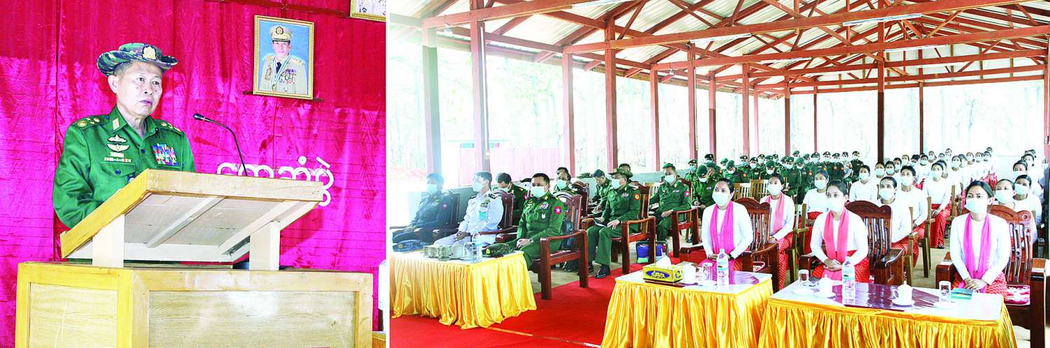 အဆိုပါအချက်အပေါ် နိုင်ငံရေးအရ ဘက်စုံဖိအားပေးမှု အသွင်ဆောင်မှုများအပေါ် စိန်ခေါ်မှုတစ်ရပ် အနေဖြင့် အောင်မြင်စွာ ရင်ဆိုင်ဖြေရှင်း ကျော်လွှားနေရကြောင်း၊ ထိုအောင်မြင်စွာ ရင်ဆိုင်ကျော်လွှားနိုင်ရန်မှာ တပ်မတော်သည် နိုင်ငံတော် ကာကွယ်ရေးအတွက် အဓိကတာဝန်ရှိသည်ကို ယုံကြည်ချက်၊ ခံယူချက်ပြည့်ဝစွာဖြင့် ကာကွယ်စောင့်ရှောက်နေခြင်းဖြစ်ကြောင်း၊ ထိုသို့ ဆောင်ရွက်နိုင်ရန် စွမ်းရည်ရှိပြီး လုံခြုံရေးအသိ၊ လုံခြုံရေးသတိဖြင့် အမြဲအသင့်ဖြစ်နေအောင် လိုအပ်သည်များ အမြဲတမ်းပြင်ဆင်နေကြရန် လိုကြောင်း၊ ကောင်းမွန်သော လေ့ကျင့်မှု၊ ကောင်းမွန်သော ပြင်ဆင်မှုဖြင့် ဒေသခံတိုင်းရင်းသား ပြည်သူများနှင့်ပူးပေါင်း၍ အခက်အခဲများကို ဆက်လက်ရင်ဆိုင် ကျော်ဖြတ်သွားရမည် ဖြစ်ကြောင်း၊ တပ်မတော်သားများအနေဖြင့် နိုင်ငံတော်မှပေးအပ်သော လစာနှင့်ရိက္ခာကို ရရှိခံစားနေခြင်းဖြစ်၍ သစ္စာအဓိဋ္ဌာန် (၄)ချက်ပါအတိုင်း နိုင်ငံတော်နှင့် နိုင်ငံသားတို့၏ သစ္စာအပေါ် အလေးထား စိတ်ဓာတ်ဖြင့် စည်းလုံးညီညွတ်စွာ နေထိုင်ကြရန်လိုကြောင်း၊ တာဝန်ရှိသူများ အနေဖြင့် စစ်သည်၊ မိသားစုဝင်များ၏ စားဝတ်နေရေးမှစ၍ ကျန်းမာရေး၊ ပညာရေး အထိ အရေးအရာများကို အလေးနက်ထား ဖြည့်ဆည်းဆောင်ရွက်ပေးရန်လိုကြောင်း၊ သို့မှသာ တပ်မတော်သားများအနေဖြင့် မိသားစုများအတွက် နောက်ဆံတင်းမှုမရှိဘဲ လုံခြုံရေးတာဝန်၊ စစ်ဆင်ရေးတာဝန်များကို အပြည့်အဝ တာဝန်ထမ်းဆောင်နိုင် ကြမည်ဖြစ်ကြောင်း၊ နိုင်ငံ့သမိုင်းကြောင်းနှင့် ပထဝီအနေအထားတို့အရ နိုင်ငံတော် ကာကွယ်ရေး မဟာဗျူဟာမှာ တပ်မတော်ကိုမဏ္ဍိုင်ပြု၍ ပြည်သူတစ်ရပ်လုံး ပါဝင်သော ပြည်သူ့စစ်မဟာဗျူဟာဖြစ်၍ ပြည်သူနှင့်တစ်သားတည်းဖြစ်အောင် နေထိုင်ပြုမူကာ ပြည်သူလူထုနှင့် ဆက်ဆံရာတွင်လည်း ချမှတ်ပေးထားသည့် ဆောင်ရန်ရှောင်ရန်များကို လိုက်နာရန်လိုကြောင်း၊ တစ်ဖက်မှာလည်း နယ်မြေ အလိုက် ပြည်သူလူထု၏ လူမှုစီးပွားမြှင့်တင်ရေးဆိုင်ရာ ကိစ္စရပ်များတွင် တတ်နိုင်သည့်ဘက်မှ ကူညီပံ့ပိုးပေးရန်လိုကြောင်း၊ ၂၀၂၀ ပြည့်နှစ်၊ ရွေးကောက်ပွဲတွင် နိုင်ငံသားစိစစ်ရေးကတ်မရှိဘဲ မဲပေးမှုများ၊ တစ်ကြိမ်ထက်ပိုသော မဲပေးမှုများစသော မဲမသမာမှုများ ဖြစ်ပေါ်ခဲ့ပြီး အာဏာကို အဓမ္မနည်းရယူရန် ကြိုးစားလာခဲ့သောကြောင့် တပ်မတော်အနေဖြင့် ၂၀၀၈ ခုနှစ်၊ ဖွဲ့စည်းပုံအခြေခံဥပဒေ အရေးပေါ်ကာလ ဆိုင်ရာ ပြဋ္ဌာန်းချက်များနှင့်အညီ နိုင်ငံတော်တာဝန်ကို ထိန်းသိမ်းဆောင်ရွက် ခဲ့ရကြောင်း၊ ၂၀၂၃ ခုနှစ်၊ ရွေးကောက်ပွဲတွင် လွတ်လပ်၍ တရားမျှတပြီး မှန်ကန်သော ရွေးကောက်ပွဲကျင်းပနိုင်ရေးအတွက် ပန်းခင်းစီမံချက်ဖြင့် အိမ်ထောင်စုဝင်စာရင်း မှန်က