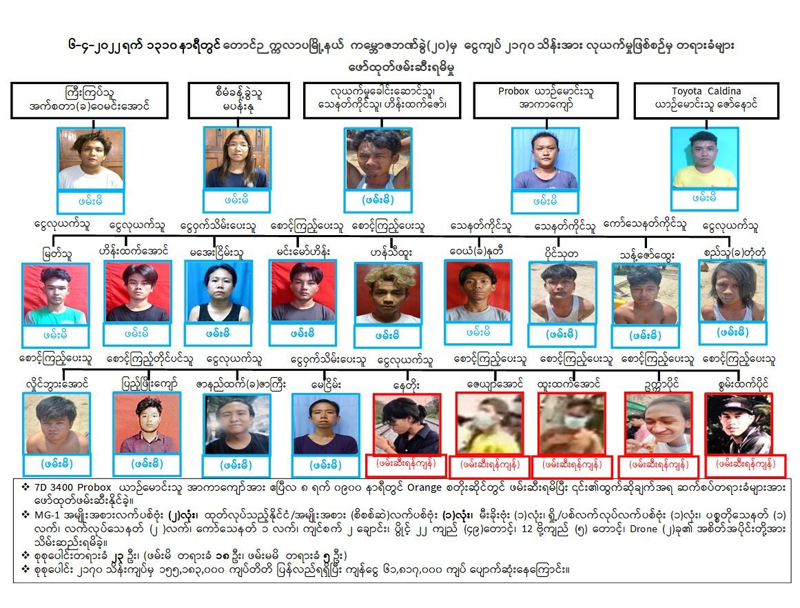 အထက်ပါဖြစ်စဉ်တွင် ဓားပြတိုက်မှုကျူးလွန်ရာတွင်ပါဝင်သူ အမျိုးသား ၁၅ ဦး၊ အမျိုးသမီး ၃ ဦး၊ စုစုပေါင်း (၁၈)ဦးတို့ကို သက်သေခံငွေကျပ် ၁၅၅,၁၈၃,ဝဝဝ၊ လက်ပစ်ဗုံး ၄ လုံး၊ မီးခိုးဗုံး တစ်လုံး၊ ပစ္စတိုသေနတ်တစ်လက်၊ လက်လုပ်သေနတ် ၂ လက်၊ ကော်သေနတ် တစ်လက်၊ ကျဉ်စက် ၂ ချောင်း၊ ပွိုင့် 22 ကျည် ၄၉ တောင့်၊ ၁၂ ဗို့လ်ကျည် ၅ တောင့်၊ Drone ယာဉ်အစိတ်အပိုင်း ၂ ခု၊ .380 AUTO ကျည်တစ်တောင့်၊ လက်ပစ်ဗုံးဖြူ့စ် ၃ ခု၊ ယမ်းမှုန့် ၁၀ ကျပ်သားခန့်၊ စိတ်ကြွရူးသွပ်ဆေးပြား ၅ ပြားတို့နှင့်အတူ ဖမ်းဆီးရမိခဲ့ပြီး ဖမ်းဆီးရန်ကျန် တရားခံများအား အမြန်ဆုံး ဖော်ထုတ်ဖမ်းဆီး ရမိနိုင်ရေး၊ သိမ်းဆည်းရန်ကျန် သက်သေခံပစ္စည်းငွေများအား သိမ်းဆည်းရမိနိုင်ရေးနှင့် ဖမ်းဆီးရမိတရားခံများအား ဥပဒေနှင့်အညီ ထိရောက်စွာအရေးယူဆောင်ရွက်သွားနိုင်ရေး လုံခြုံရေးတပ်ဖွဲ့ဝင်များက ဆက်လက်ဆောင်ရွက်လျက်ရှိကြောင်း သတင်းထုတ်ပြန်အပ်ပါသည်။