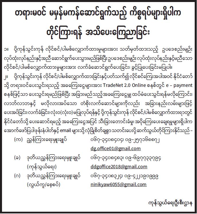 တရားမဝင် မမှန်မကန်ဆောင်ရွက်သည့် ကိစ္စရပ်များရှိပါက တိုင်ကြားရန် အသိပေးကြေညာခြင်း 04/12/2022 တရားမဝင် မမှန်မကန်ဆောင်ရွက်သည့် ကိစ္စရပ်များရှိပါက တိုင်ကြားရန် အသိပေးကြေညာခြင်း