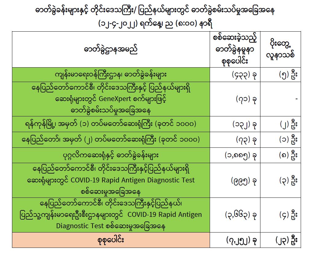 သို့ဖြစ်ပါ၍ ယနေ့အထိ ဓာတ်ခွဲနမူနာစုစုပေါင်း (၇,၇၉၈,၄၃၄) ခုအားစစ်ဆေးခဲ့ပြီး COVID-19 ဓာတ်ခွဲအတည်ပြုလူနာ စုစုပေါင်း (၆၁၂,၄၀၆) ဦး ရှိပြီ ဖြစ်ပါသည်။