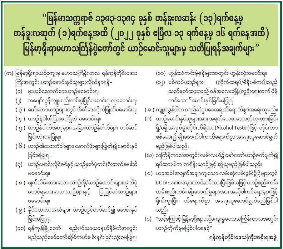 “မြန်မာသက္ကရာဇ် ၁၃၈၃-၁၃၈၄ ခုနှစ် တန်ခူးလဆန်း (၁၃)ရက်နေ့မှ တန်ခူးလဆုတ် (၁)ရက်နေ့အထိ (၂၀၂၂ ခုနှစ် ဧပြီလ ၁၃ ရက်နေ့မှ ၁၆ ရက်နေ့အထိ) မြန်မာ့ရိုးရာမဟာသင်္ကြန်ပွဲတော်တွင် ယာဉ်မောင်းသူများမှ သတိပြုရန်အချက်များ” 04/13/2022